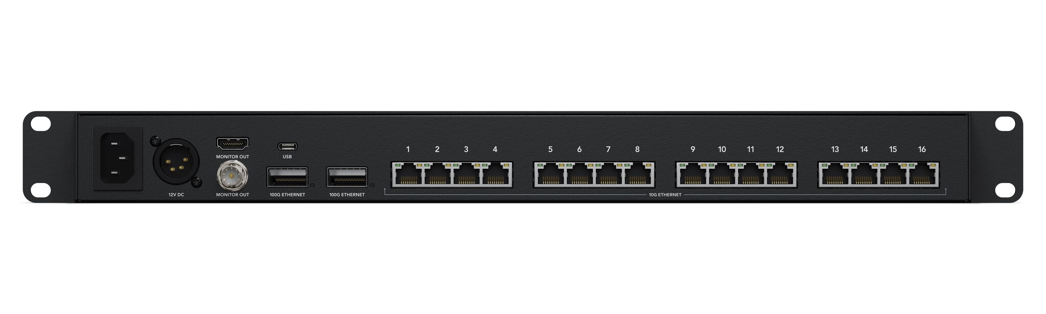 16 x 10Gb/s RJ-45 connectors supporting 10/100/1000/10G BASE-T for SMPTE-2110 IP video in and out, configuration and firmware updates.