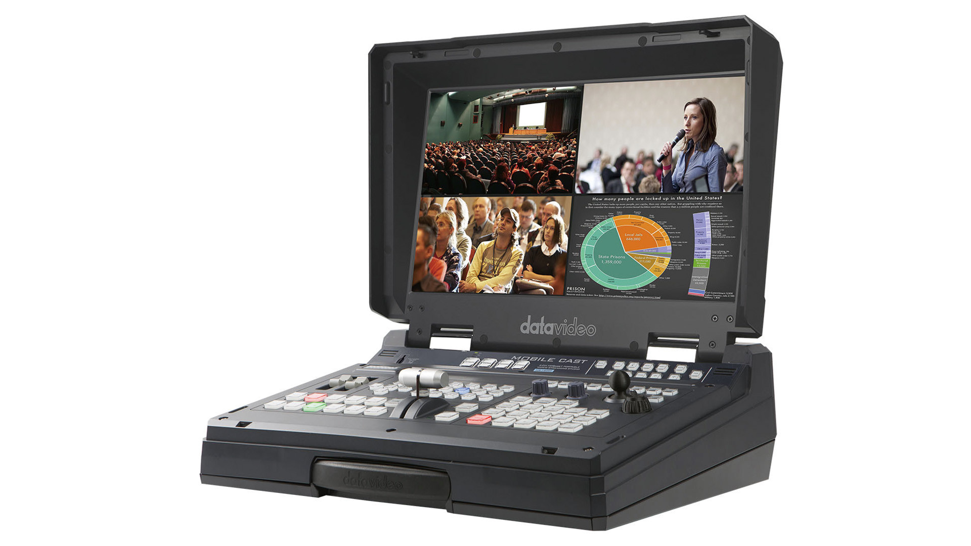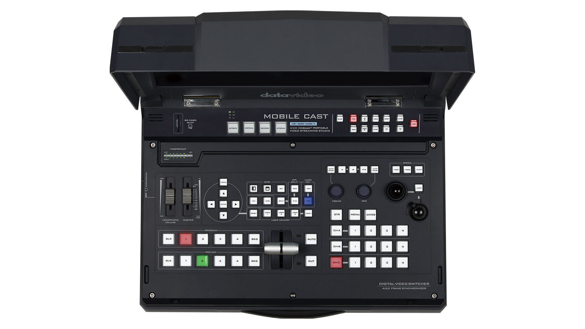 Datavideo's HS-1600T MARK II MobileCast offers a comprehensive live video production solution, integrating video switching, streaming, recording, auto-tracking, camera controlling for professional-quality broadcasts.