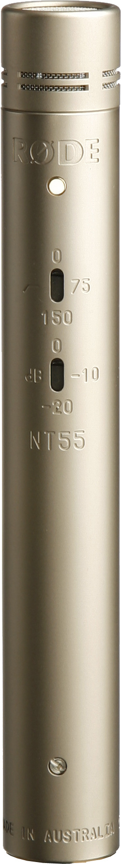 Like the NT5, the RDE NT55 is a small-diaphragm, true-condenser cardioid microphone, sometimes referred to as a 'pencil mic'. The NT55 adds both a three position pad (0, -10dB, -20dB) and three stage high pass filter (Off, 75Hz, 150Hz), and includes the interchangeable NT45-O omnidirectional capsule.