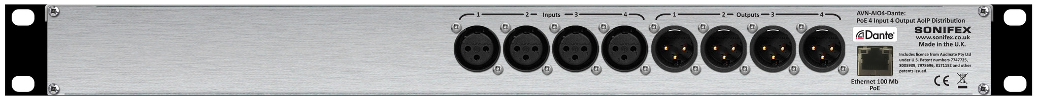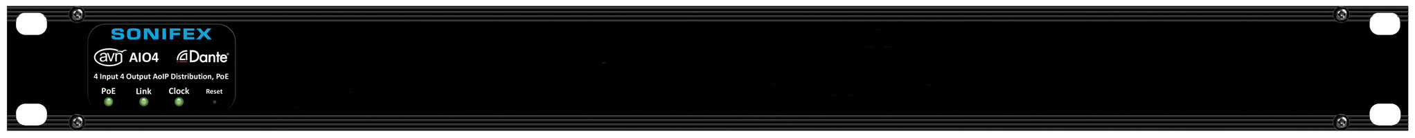 The AVN-AIO4 audio converter and interface converts up to four analogue inputs and four analogue outputs to and from the Dante Audio-over-IP networking standard. This cost effective 1U rack-mount unit offers an easy solution for AV professionals and system integrators. It is simple to configure and operate, with all set-up done via the standard Dante Controller software and power via POE (Power Over Ethernet).