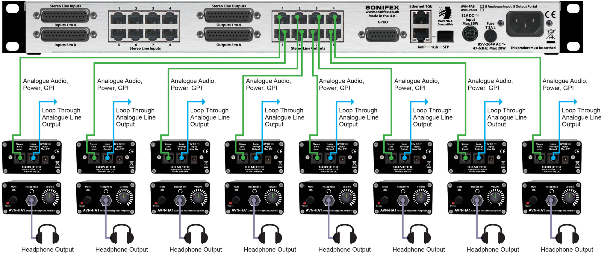 The AVN-PA8 can be combined with multiple AVN-HA1 headphone amplifiers to provide a headphone distribution system - the portal output connections can supply analogue power to satellite headphone amplifiers.