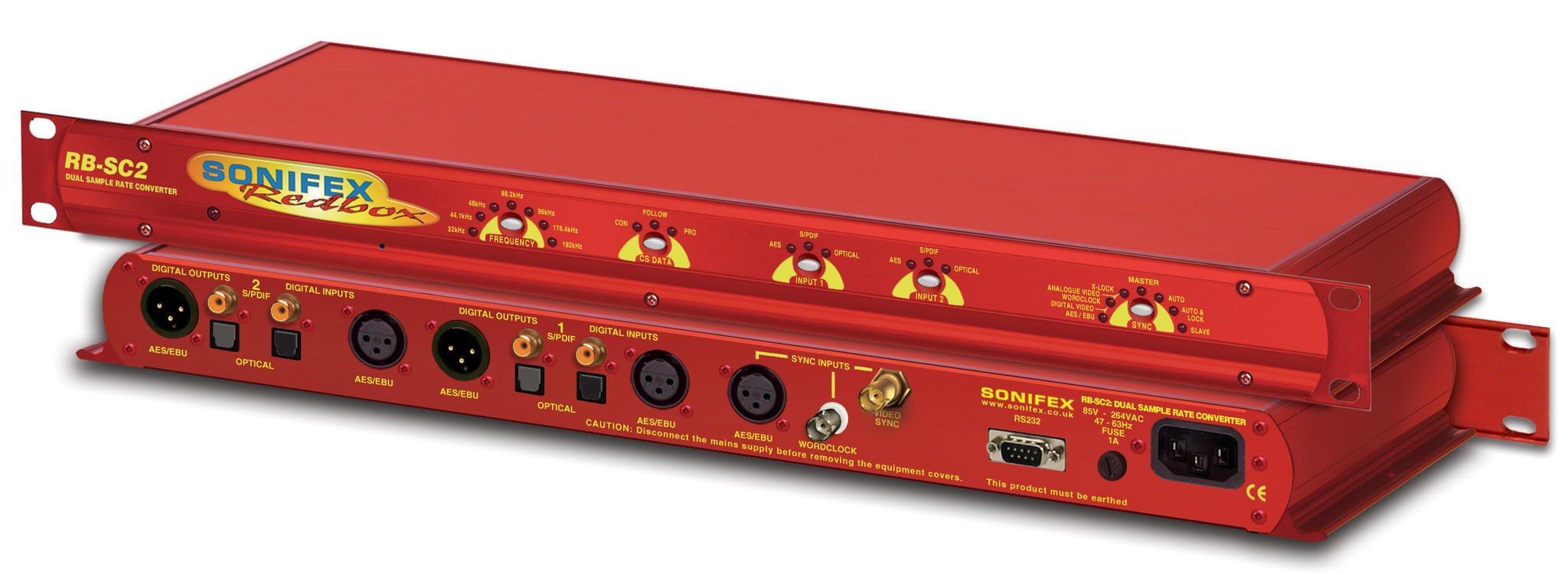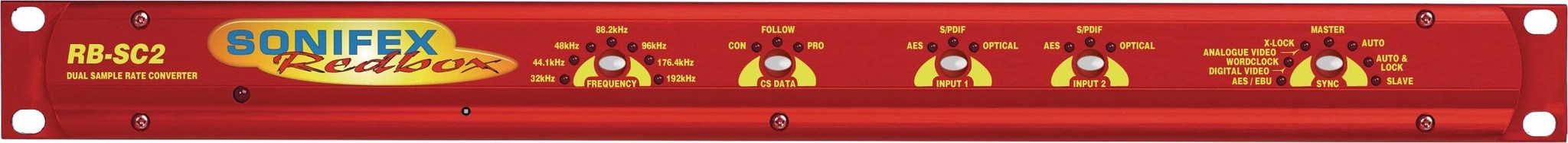 The RB-SC2 sample rate converter is a 1U rack-mount which produces AES/EBU, S/PDIF and TOSlink optical level digital audio outputs from a balanced AES/EBU, S/PDIF and TOSlink optical level digital audio inputs. The sample rate of the outputs can be set by an internal clock or from various external synchroniser sources.