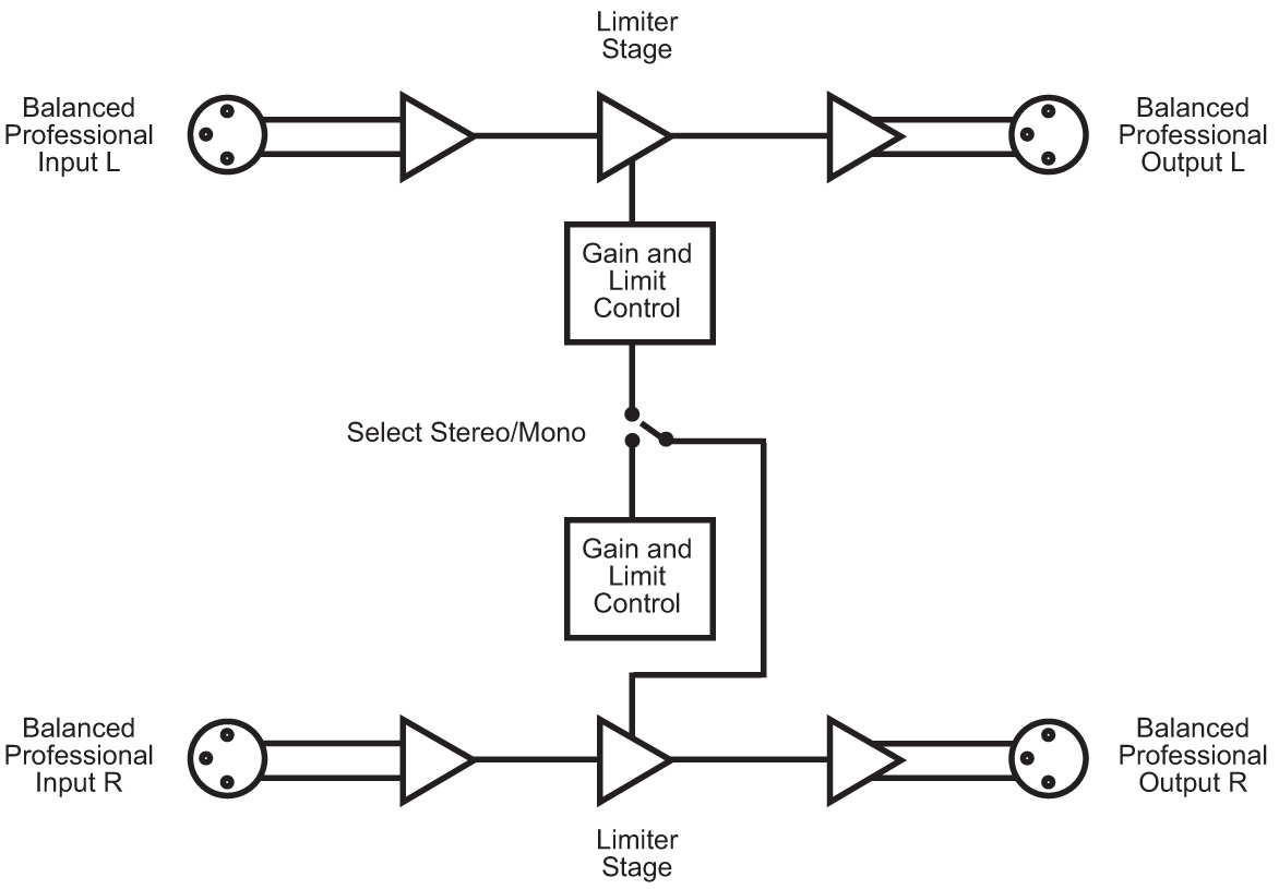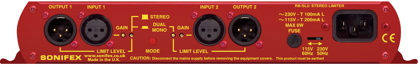 The rear panel mode switch changes the unit from dual mono to stereo, when only the pre-sets for channel 1 (left) are active and apply to both channels. Stereo limiting operates by limiting both left and right outputs if either left or right input needs to be limited. Dual mono limiting operates by limiting left and right signals individually, so you can use the RB-SL2 as two separate mono limiters.