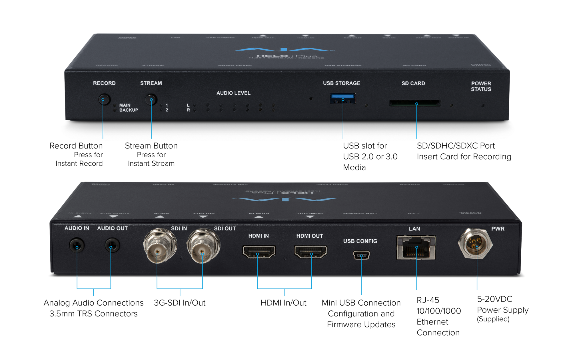 HELO Plus is a compact, advanced H.264 streaming and recording stand-alone appliance. HELO Plus offers both SDI and HDMI I/O with the capability to stream up to 1080p60 to a Content Delivery Network and record simultaneously. Two separate streaming destinations can be set up and recordings can be made to a combination of SD card, USB storage and NFS or CIFS network storage. HELO Plus also provides Picture-In-Picture and graphics functionality in hardware for compelling presentations made simple.