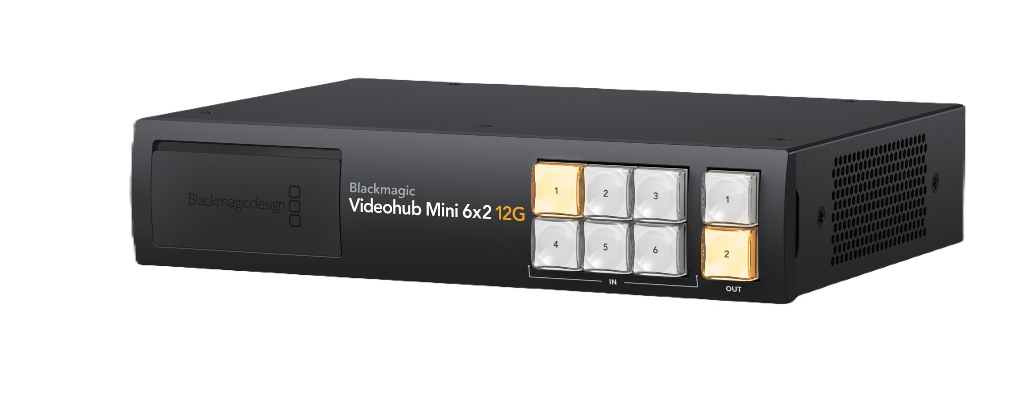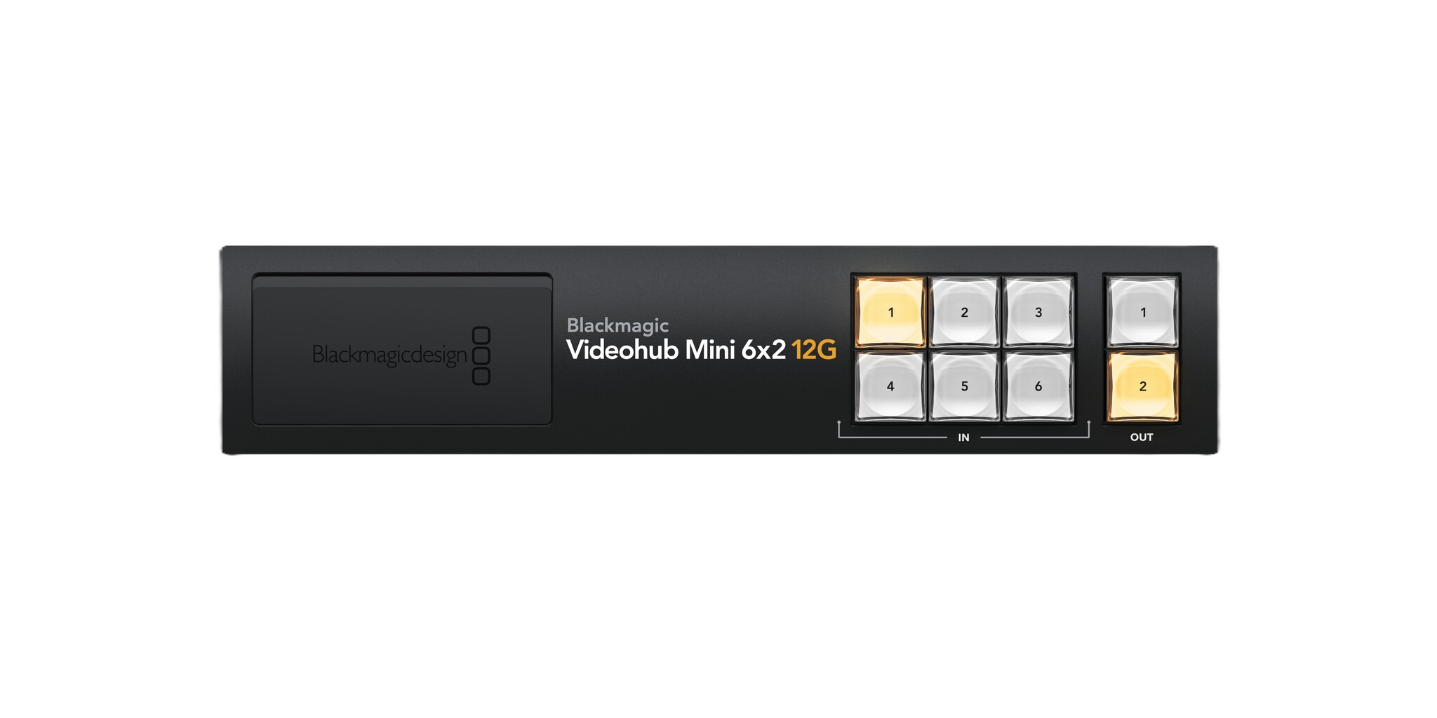 Blackmagic Videohub Mini 6x2 12G is a compact zero latency video router that supports any combination of SD, HD and Ultra HD on the router at the same time. It has 6 12G-SDI inputs and 2 12G-SDI outputs plus reference connections for locking clean switch outputs in a compact 1/2 rack width size. The front panel control panel lets you quickly route a video connection and even includes an emergency 12G-SDI connection for patching in external gear and USB-C webcam video out. It also features SDI re-clocking, external Ethernet control and supports all SDI video standards up to 2160p60.