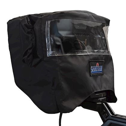 Universal rain cover for Viewfinder Monitors. The cover has an Easy-on-Easy-off construction with hook and loop fasteners. The side handles can be reached through the cuffs on the left and right side of the cover.