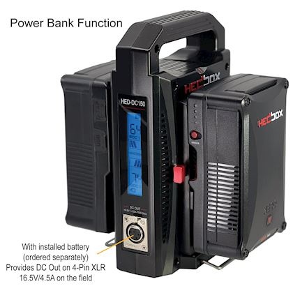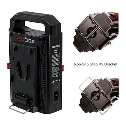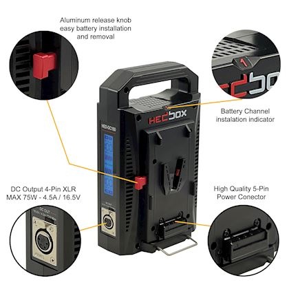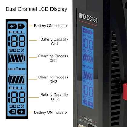 Hedbox HED-DC150V is an Intelligent Digital Dual LCD Battery Charger for V-Mount (V-Lock) Batteries featuring simultaneous charging and UPS/Power Bank capabilities. LCD status indicators with backlight provides clear, accurate and precise reporting while integrated support stands ensure stable operation when only one battery is mounted. The included 4-pin XLR female to male DC Power Cable (RPC-DC4X4) enables the HED-DC150V to be used as a Power Bank, providing power to the DC output from the AC-input or fitted V-Lok batteries. DC output power of up to 14.5V 4.5A 75W is available.