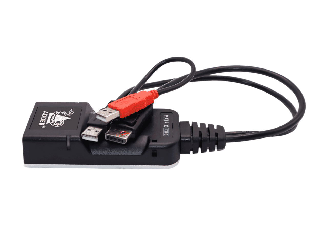 An ADDERView Matrix C100 Series ZeroU IP KVM dongle for extension and matrix of video, audio and USB over a single cable.