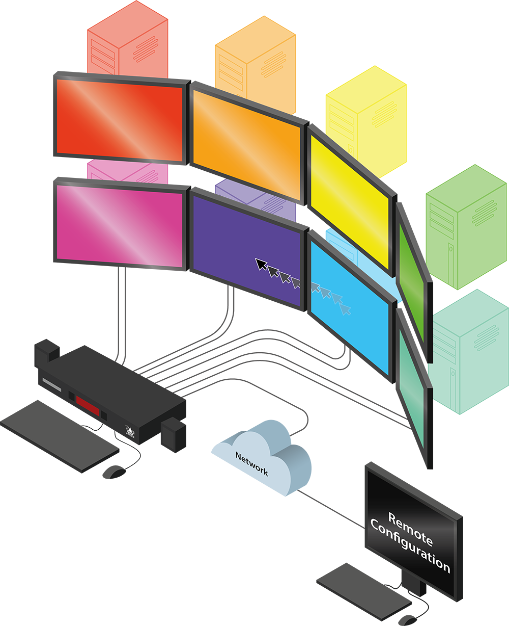 - Improved desk ergonomics: one keyboard and mouse to operate up to eight computers, saving desk space and reducing mental load