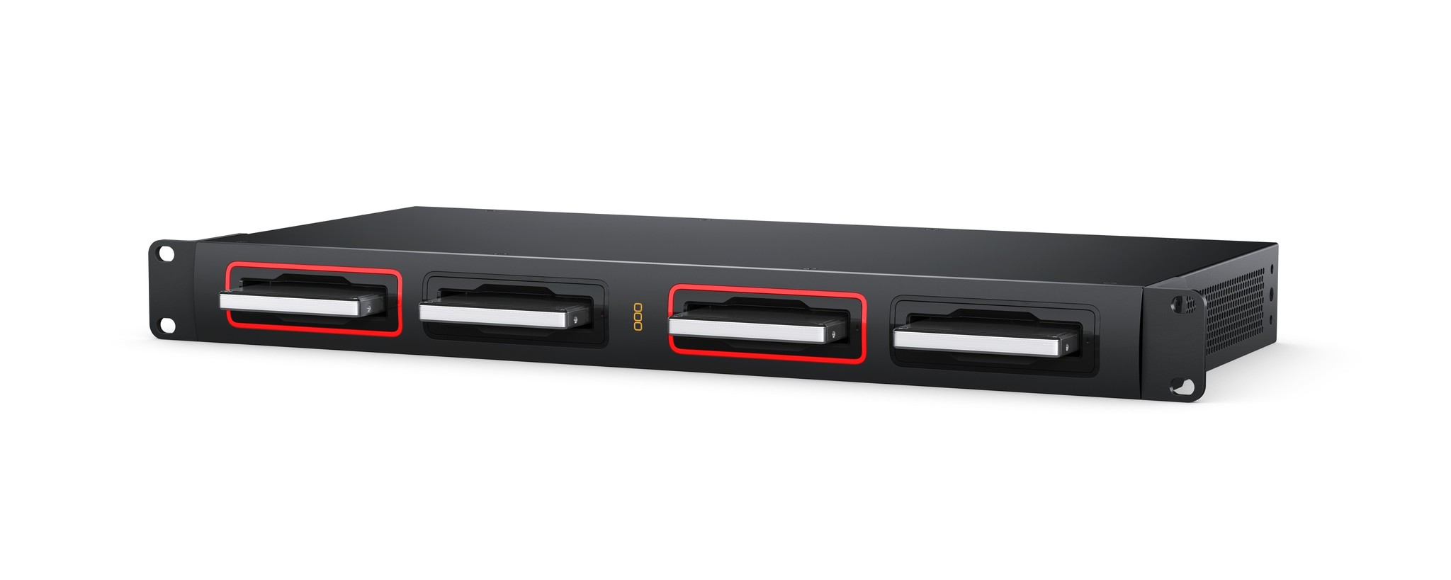 LED bezel indicator lights around SSD media slots.