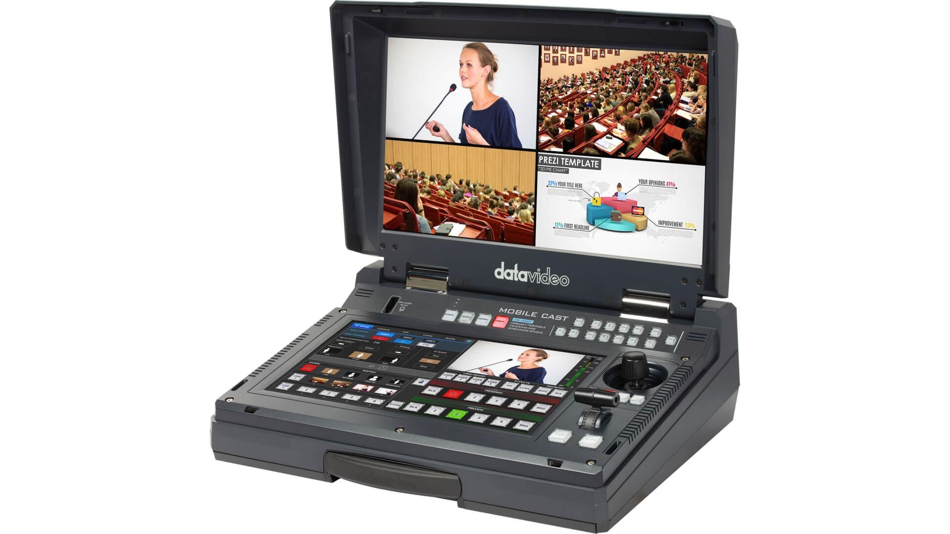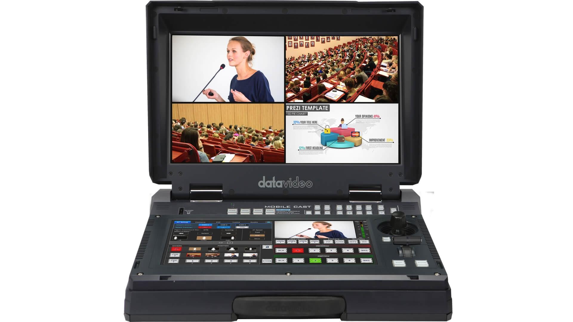 Datavideo HS-1650T is a compact 4-channel HDBaseT production studio designed for live events, education, and conferences. It combines video switching, streaming, recording, camera control, and audio mixing in one portable unit.