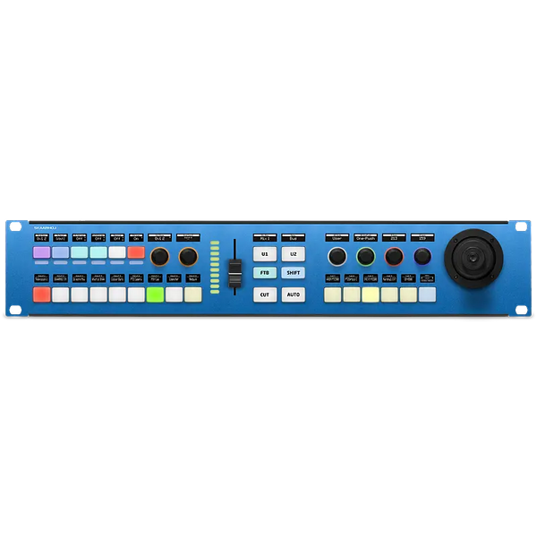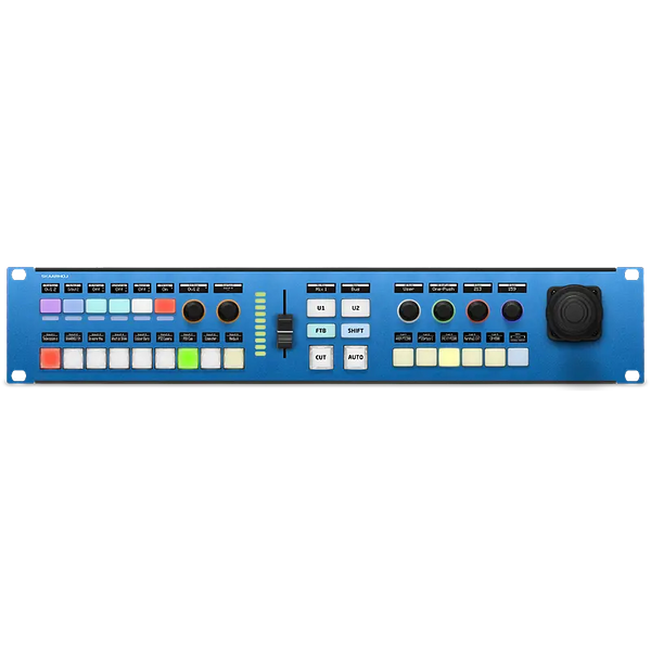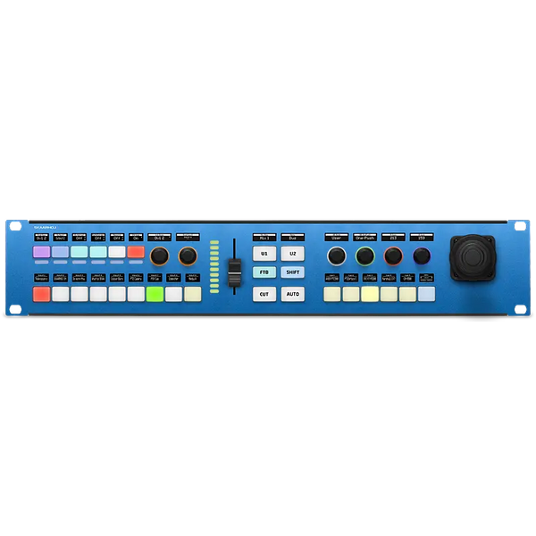 Rack Fusion Live integrates advanced PTZ control into a live switching interface, tailored for small production teams. This compact, versatile unit can be positioned on a desk or mounted in a rack, powered by the Blue Pill with PoE+. It boasts RGB metering LEDs, four-way buttons with OLED displays, high-quality backlit encoders, a 3-axis joystick for precise camera movements, and a custom 9-key bus row. The ME section includes a transition fader with RGB LED, multi-level shifting, user keys, and multifunction keys for quick preset and camera selections. Designed and manufactured in Denmark, it promises reliability and efficiency.