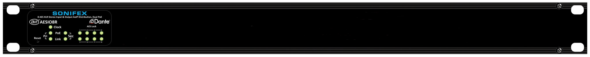 The AVN-AESIO8R audio converter and interface converts up to eight digital stereo AES3 inputs and eight digital stereo AES3 outputs to and from the Dante Audio-over-IP networking standard. Each input can accept sample rates from 32kHz to 192kHz, which will be sample rate converted to the Dante system sample rate. A valid input signal is confirmed by front panel AES3 lock LEDs for each input. All outputs follow the Dante system sample rate.