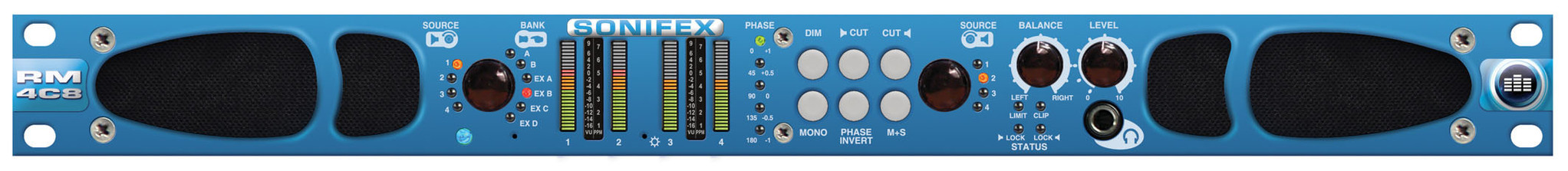 The RM-4C8 offers the same functionality as the RM-2S4 but with an additional source selector so that any of the 4 channels in the selected group, or bank, can be monitored independently on left and right speakers.
