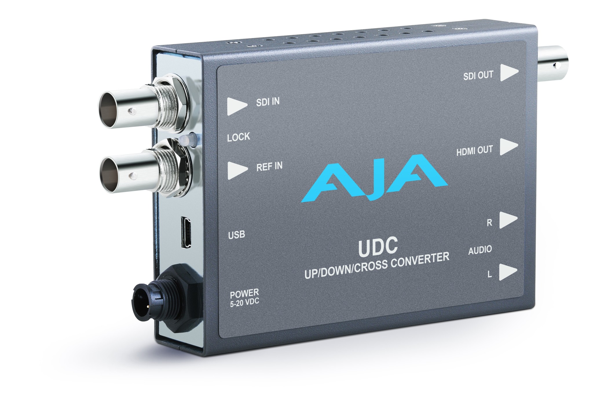 The UDC is a broadcast quality Up/Down/Cross Mini-Converter which can convert between SD, HD, and 3G video formats. Using the same AJA industry leading conversion technology as in our model FS2, the UDC provides very high quality conversions at a low price. I/Os include SD/HD/3G SDI Input and Output, HDMI output, and 2-channel RCA style audio output. The UDC can be controlled by local dipswitches with additional control available via USB and AJA's MiniConfig application. A Reference Input allows the UDC to be locked to a local reference.
