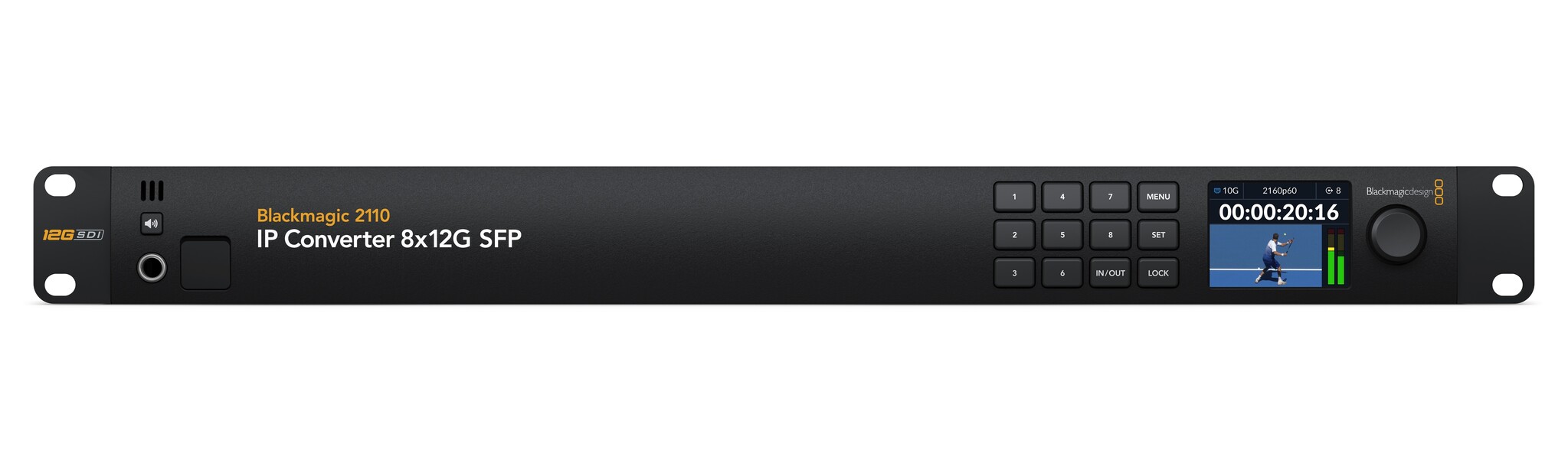 Blackmagic 2110 IP Converter 8x12G SFP lets you add SMPTE-2110 UP video to 12G-SDI broadcast equipment. It features 8 independent bidirectional 12G-SDI to SMPTE-2110 IP video converters using SFP modules for compatibility with optical fiber Ethernet modules for long distances. Its 1RU design includes and control panel with LCD and support HD and Ultra HD standards up to 2160p60.