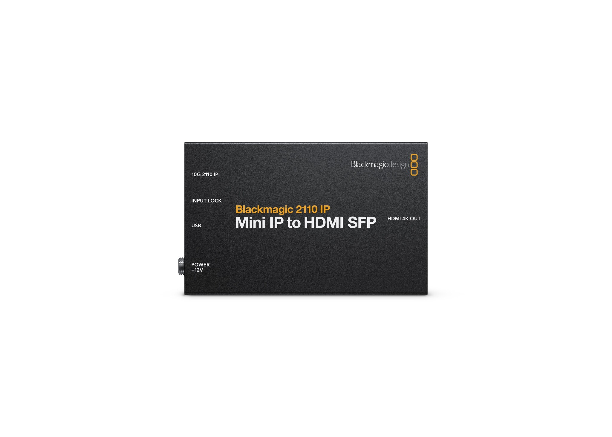 Blackmagic 2110 IP Mini IP to HDMI SFP lets you monitor 2110 IP video and audio on any HDMI monitor or TV over long distances. Its compact design means it can be placed behind displays, while it connects to a standard SFP socket that supports a 10G optical fiber Ethernet module, so you connect it over long distances. Blackmagic 2110 UP Mini IP to HDMI SFP also supports 3G, 6G and 12G optical fiber SDI modules for regular SDI video compatibility. Powers from the included 12V DC power supply.