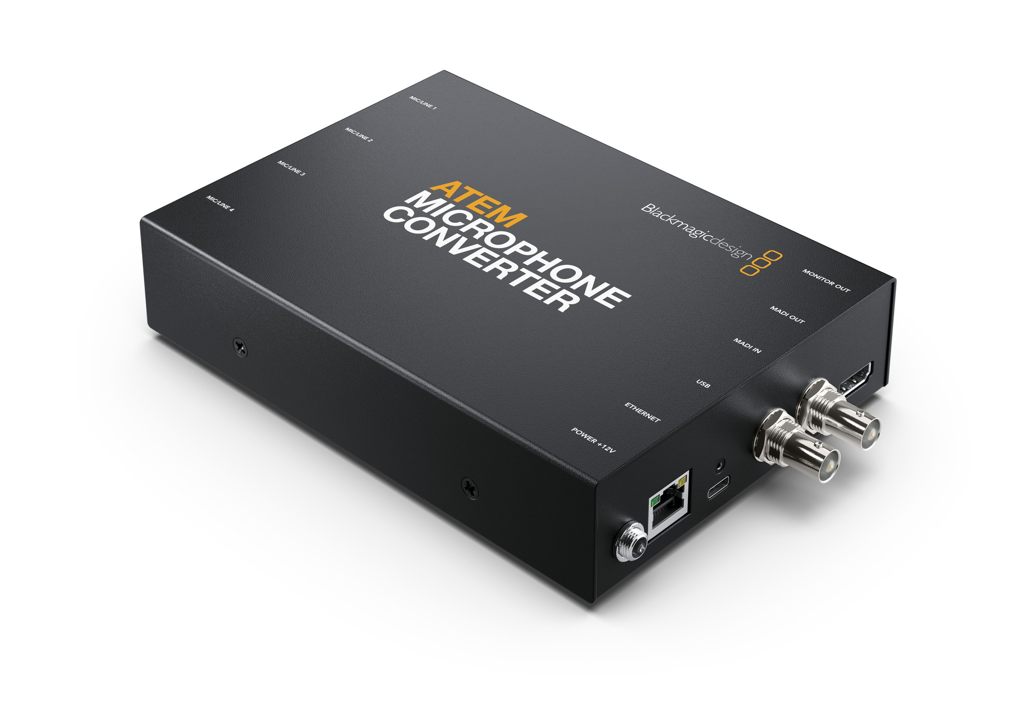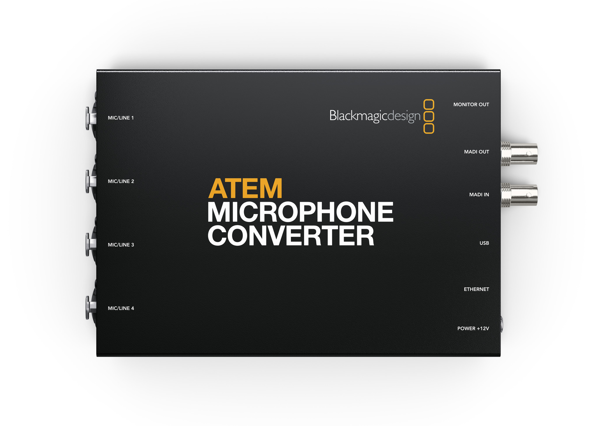 Now it's easy to expand the MADI input on the ATEM Television Studio switchers to add multiple microphones or external audio mixer sources. The ATEM Microphone Converter simply plugs into the ATEM Television Studio MADI port, so there's no setup required and additional units can even be daisy chained for more sources. Each converter has 4 analog inputs that are mic/line selectable and have phantom power. The design features amazing audio quality with an extremely low noise floor, a wide dynamic range and very low distortion. The design even uses 8 separate ADCs on each separate input that work together to extend dynamic range! There is also an HDMI monitoring output with scrolling audio waveforms.