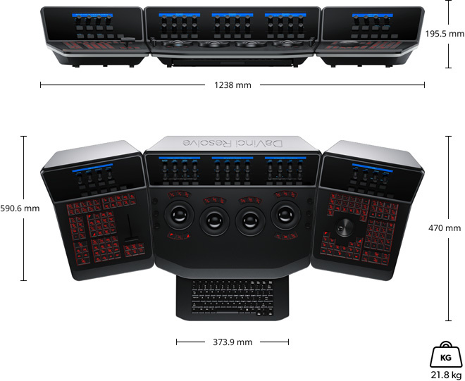 Designed with three ergonomically connected control surfaces and a pull out keyboard, DaVinci Resolve Advanced Panel gives you complete command of every color grading session! Each correction control has a separate soft key, knob, high resolution weighted trackball or ring so you can experiment quicker to create a wider range of looks!