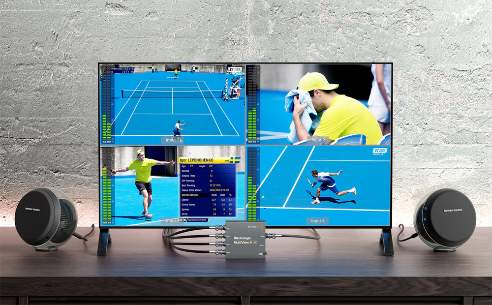 Blackmagic MultiView 4 HD is a multiviewer that lets you simultaneously monitor 4 completely independent SDI video sources on a single display! You can monitor any combination of SD and HD formats and frame rates, all at the same time. Each view can display overlays with information such as custom labels, audio meters and more. MultiView 4 HD has both SDI and HDMI outputs for monitoring on professional SDI displays, projectors or even big screen televisions!