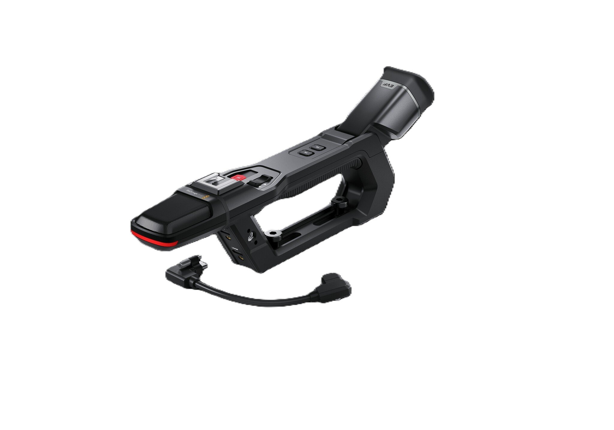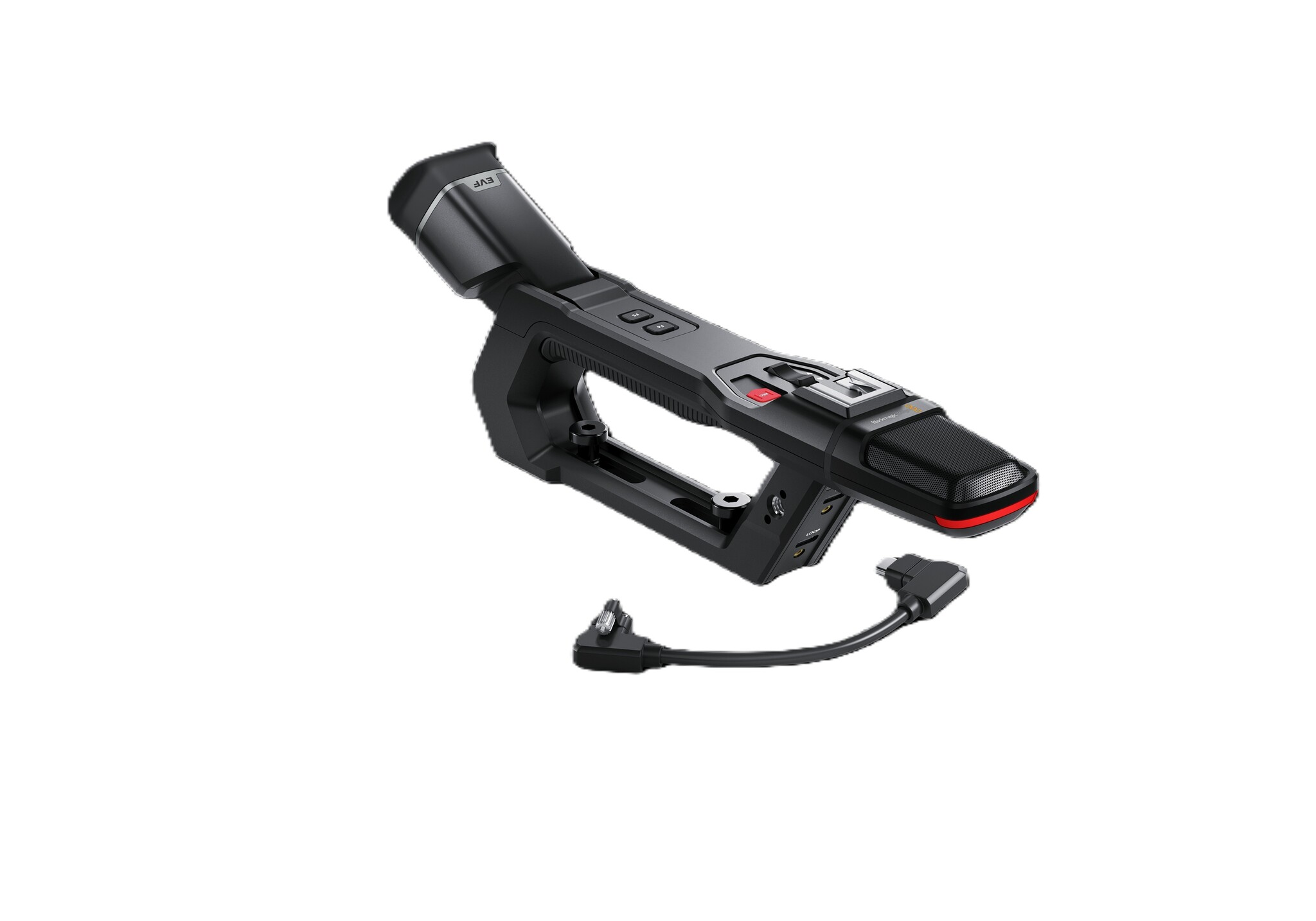 Professional handle for broadcast production with built in OLED viewfinder and precision glass optics, stereo microphone, record start/stop button and custom function buttons.