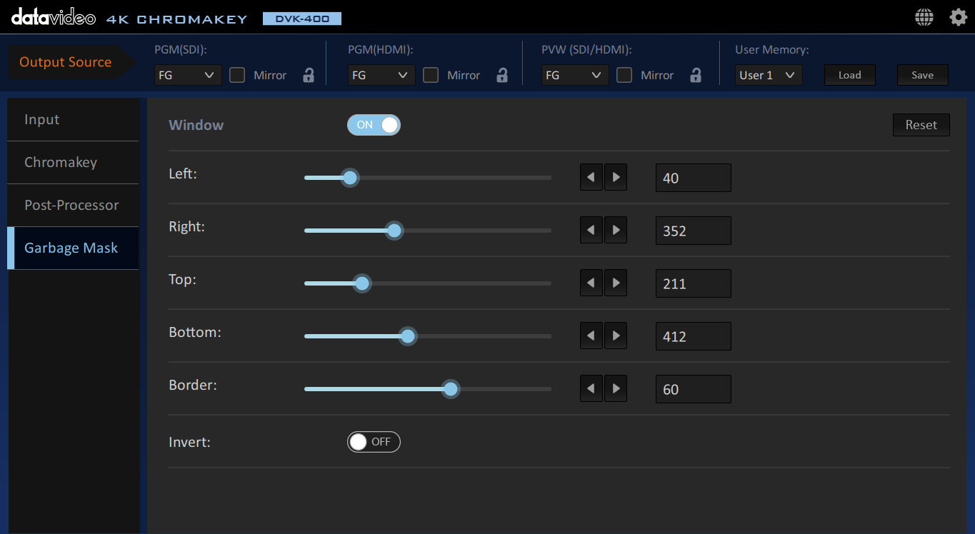 Chromakeying with the DVK-400 can be done on standard green and blue backgrounds, however with the addition of special features such as Open Angle and an impressive Automatic chromakey mode you can even use colours that divert from the standard.