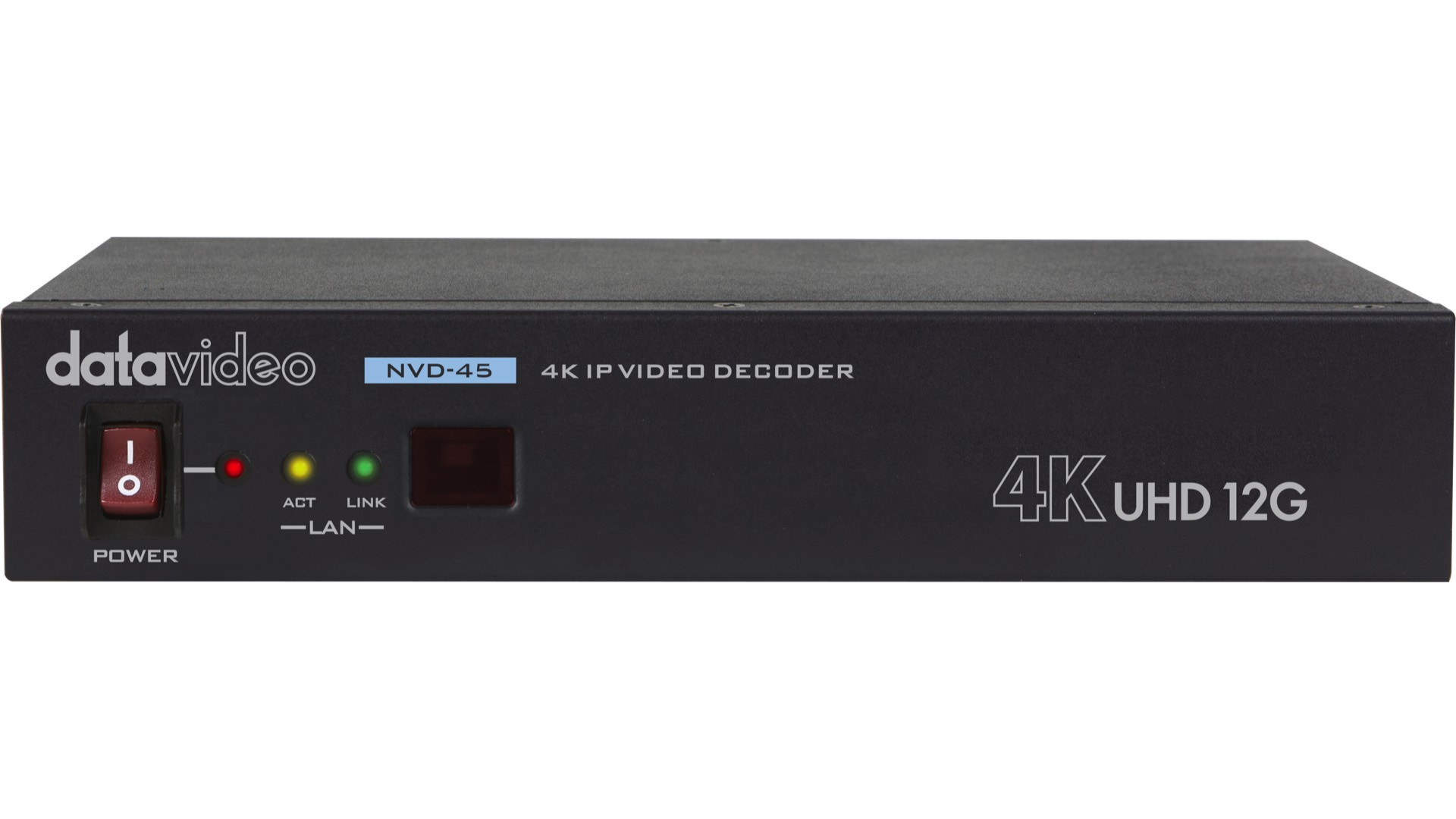 Datavideo NVD-45 is a H.264/H.265 4K IP video decoder with SDI, composite video, and analog audio outputs.