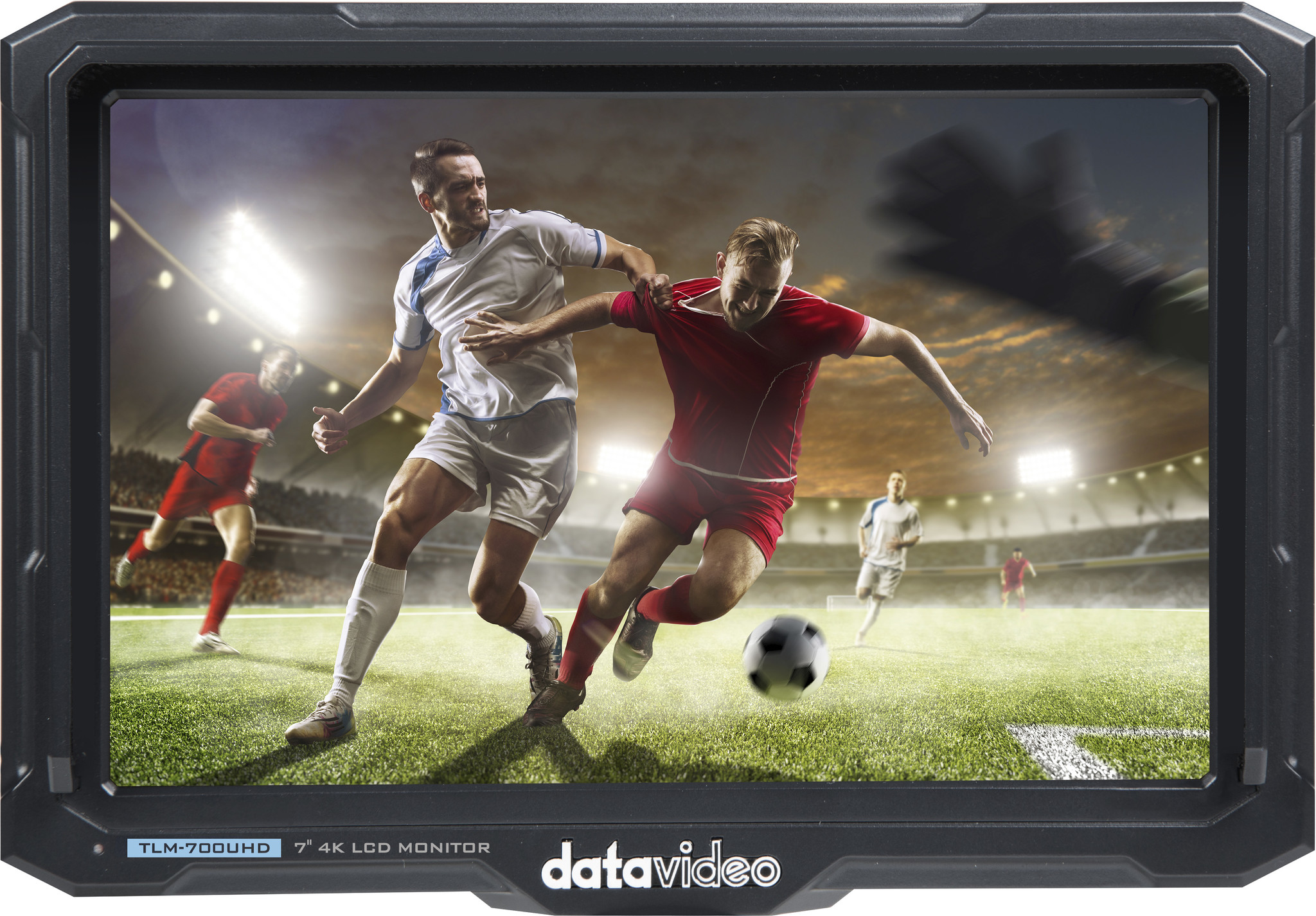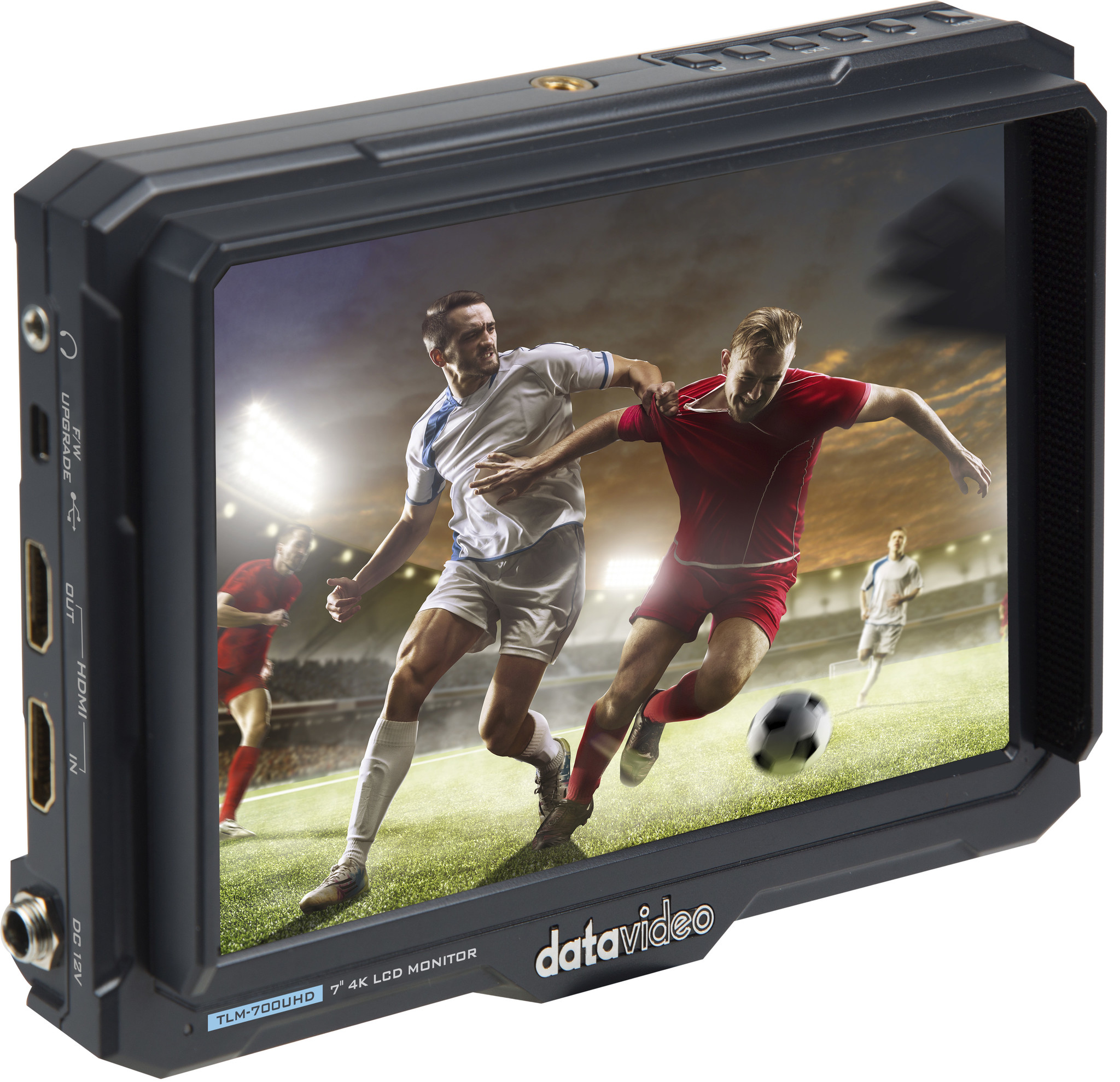 Datavideo's TLM-700UHD LCD Monitor accepts 4K 50/60p inputs and displays them on a 7" screen. The monitor is a 1920x1080 Full HD panel which provides 170° of viewing angle. The field monitor supports both DCI 4K and Ultra HD signal inputs and outputs.