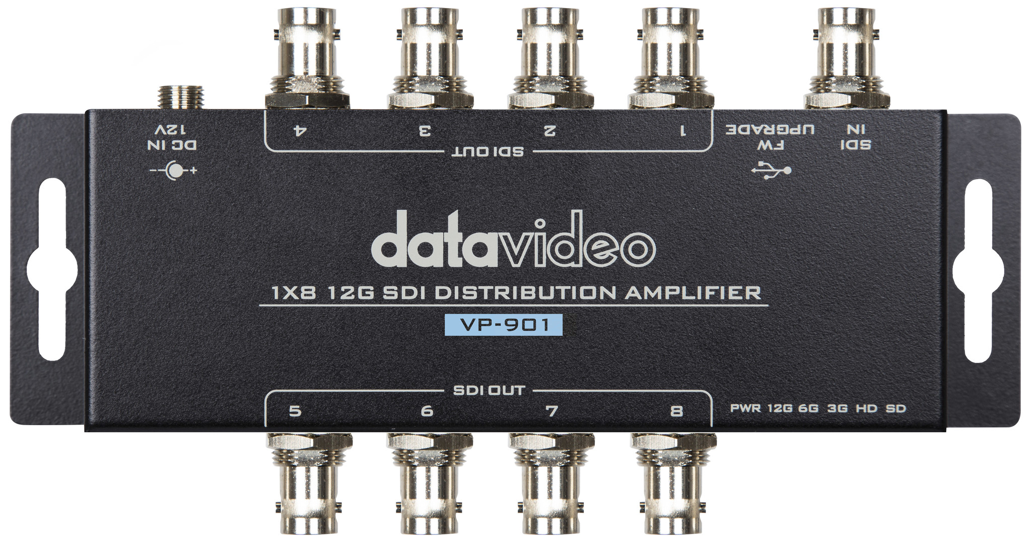 The VP-901 12G SDI Distribution Amplifier can distribute a single 12G, 4K, HD, or SD-SDI input into eight SDI outputs. It is a reliable video device, which splits an SDI, HD-SDI, 3G-SDI, 6G-SDI, or 12G-SDI video source to SDI compliant video displays simultaneously. It also supports re-clocking for a clean signal over long cable runs.