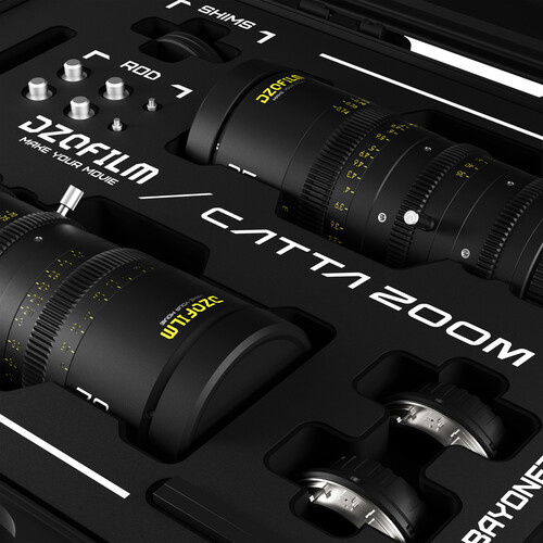 Add two full-frame zoom lenses to your production kit to cover multiple focal lengths and cameras with this Catta 35-80mm & 70-135mm T2.9 E-Mount Cine Zoom 2-Lens Bundle from DZOFilm. The kit includes a black Catta E-mount 35-80mm T2.9 zoom lens, a black Catta E-mount 70-135mm T2.9 zoom lens, two front lens caps, two rear caps, two shim sets, two support bases, and two support rods.
