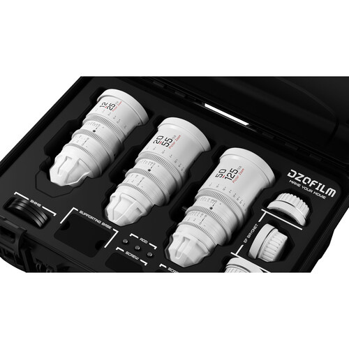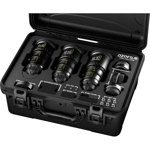 This Pictor T2.8 Super35 Zoom 3-Lens Kit from DZOFilm consists of the 12 to 25mm, 20 to 55mm, and 50 to 125mm zooms in a standard black finish. Together, these lenses provide a wide extended zoom range with a relatively fast maximum aperture. Each zoom covers Super35 sensors and has a similar length, weight, lens gear positions, and front diameter, enabling fast lens swaps.