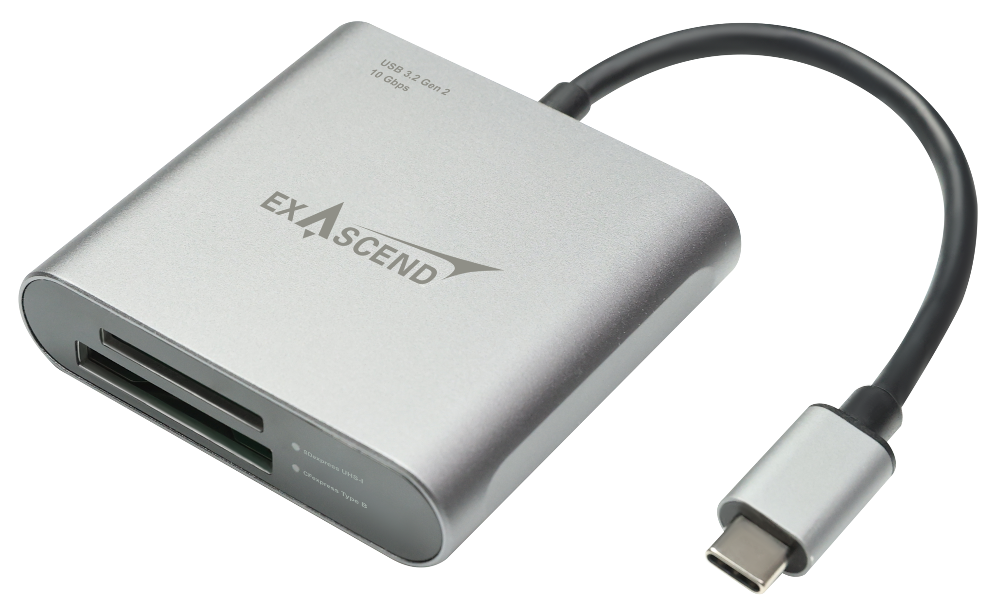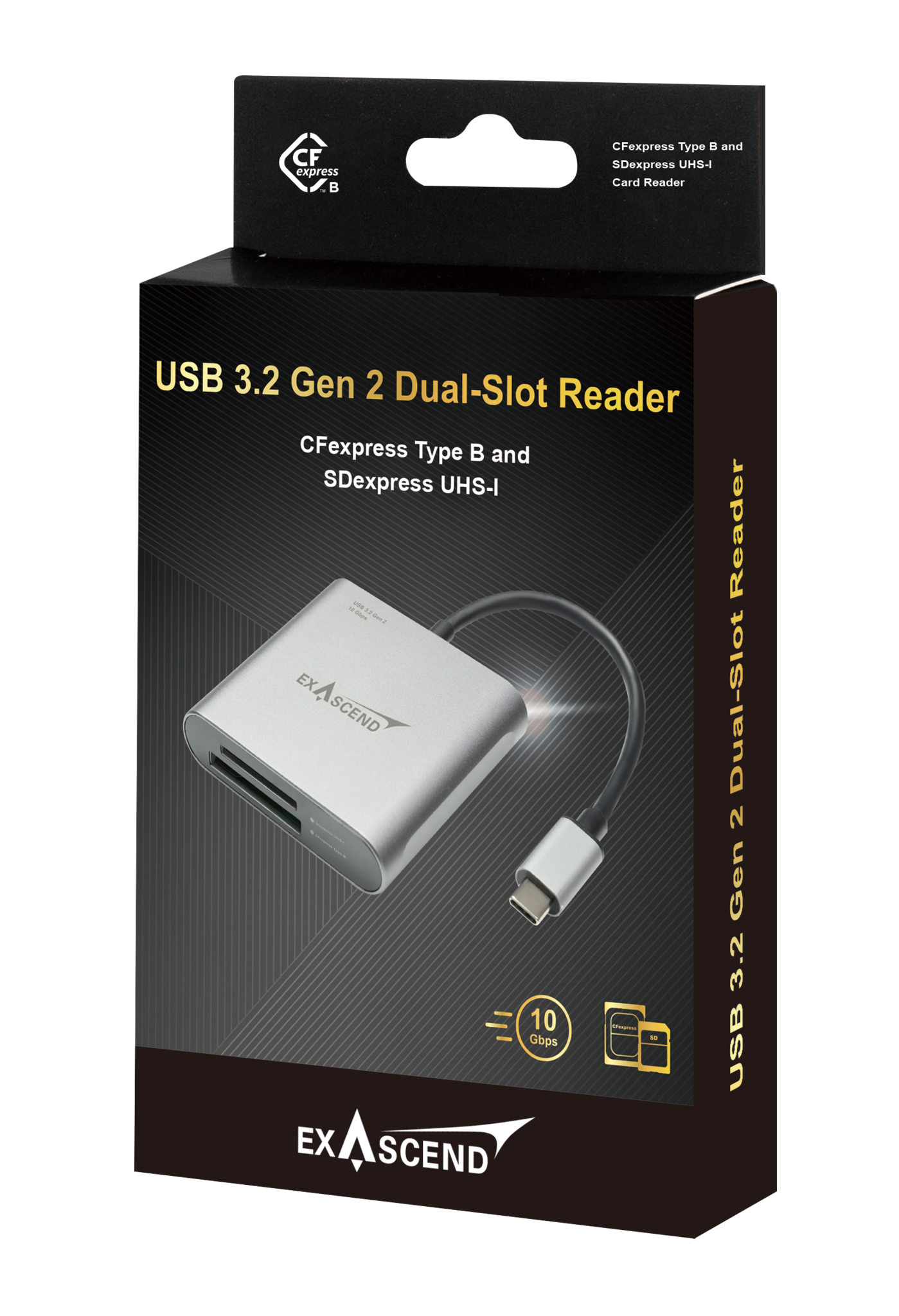 Exascend's 2-in-1 CFexpress/SD Express reader combines the high speed of the USB 3.2 Gen 2 interface with the benefits of USB Type-C, enabling up to 10 Gbps data transfer rates. Featuring two slots, the reader works with both CFexpress Type B and SD cards - two of the most popular storage media adopted by high-end camera systems.