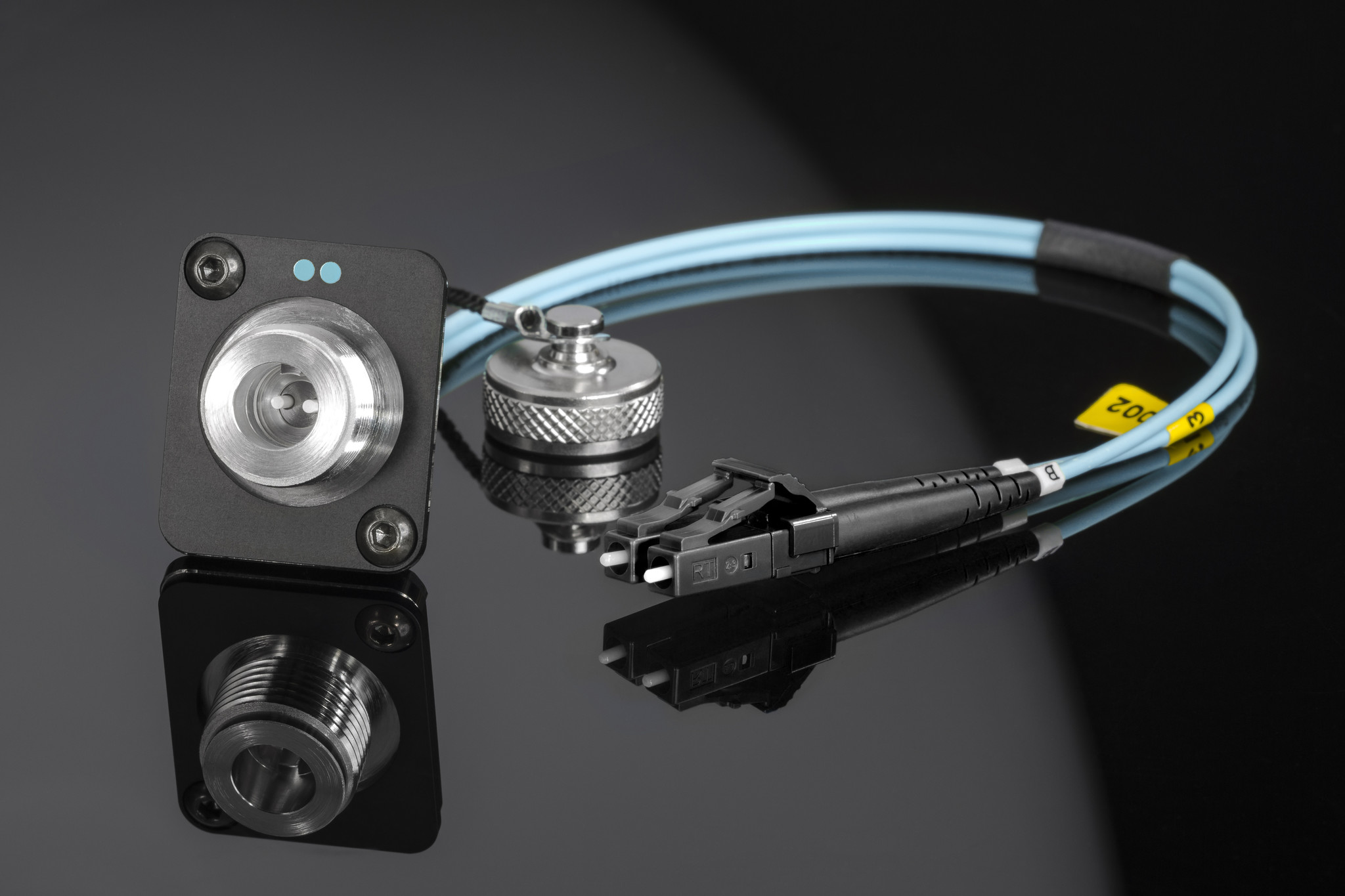 2Core connector for mounting in a chassis or 19 inch panel, with standard D-size form factor, that connects to your 2Core main cable. At the back it sports a 0.5 meter fanout with LC Duplex connector.