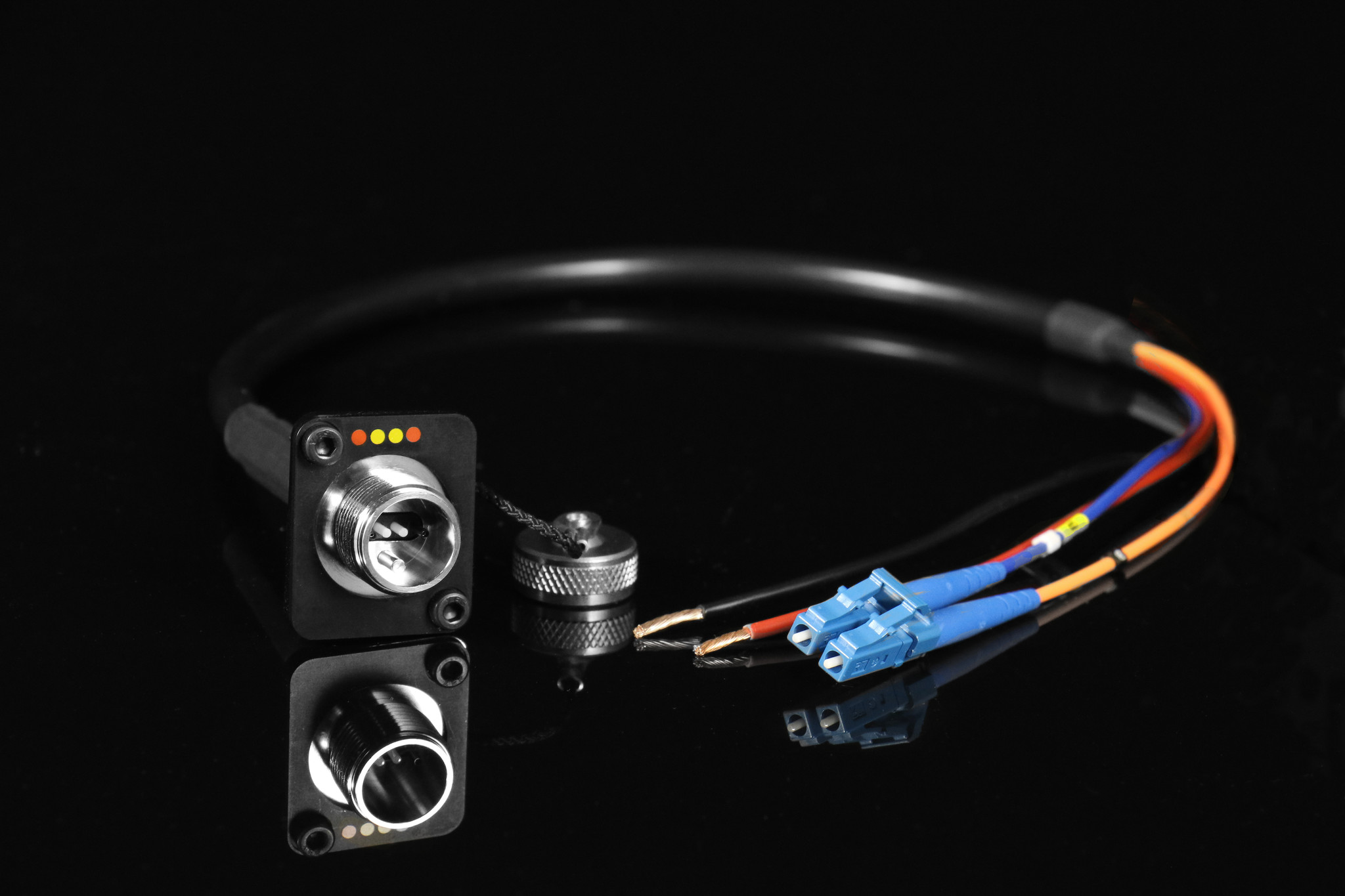 2Core hybrid connector for mounting in a chassis or 19 inch panel, with standard D-size form factor, that connects to your 2Core hybrid main cable. At the back is a 0.5 meter fanout with copper and LC Duplex connector.