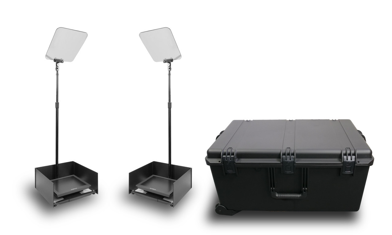 The StagePro Presidential Pair design utilizes custom aluminum hardware for high strength, featuring lightweight and tool-less setup and operation. The reversing monitors allow for prompting using text or presentations using the included Flip-Q Pro software for PC and Mac. 2 teleprompters are included along with a distribution amp and 25 foot extension cables. The included monitor offers a variety of inputs including 3G-SDI, VGA, composite and HDMI. All Prompter People monitors are self-reversing* for easy prompting. The lightweight, long life LED backlit display offers a bright 400 nit image (nit is the unit of visible-light intensity), High Bright monitors for outside use are available. A durable flight case is available.