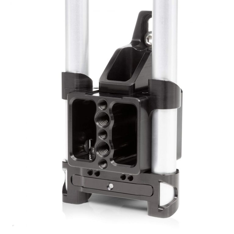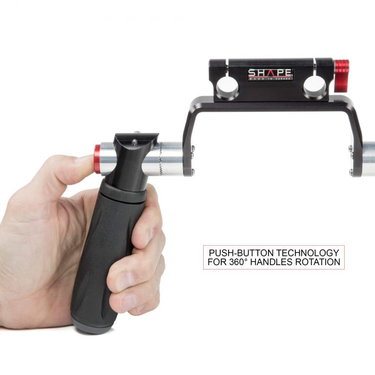 The Shoulder Mount Kit from SHAPE features a CNC machined aluminum cage with 1/4"-20 threaded holes on the top and bottom to secure the Blackmagic Pocket Cinema 4K camera. This mount includes a top handle with a Push-Button, a 15 mm LW quick release rod base system, 1 pair of 18" 15 mm rods, a pair of quick handles with a Push-Button, a shoulder mount, and a back pad.