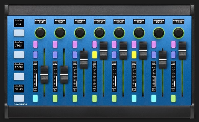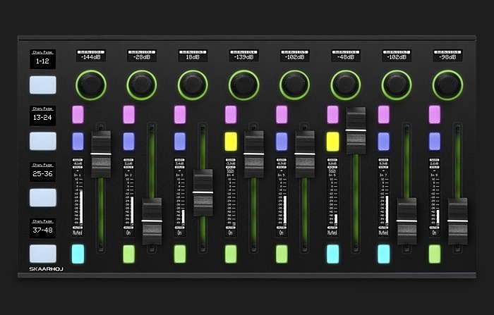 A cutting-edge networked fader bank designed to seamlessly control audio processors, mixers, DSPs, audio software, and a variety of other applications requiring tactile faders, such as lighting control and camera shading. This innovative controller features eight unique SKAARHOJ channel strips, each equipped with a vibrant OLED level meter display, smooth motorized fader, precise encoder, and dedicated 2-way buttons. Additionally, four versatile 4-way buttons enable users to easily toggle through layers or menus and fire snapshots, delivering unmatched flexibility and convenience.