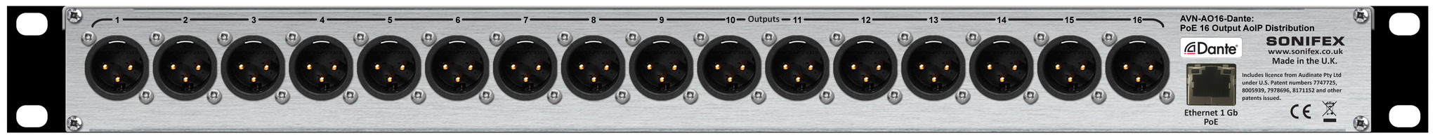 The AVN-AO16 audio converter and interface converts up to sixteen analogue outputs from the Dante Audio-over-IP networking standard. This cost effective 1U rack-mount unit offers an easy solution for AV professionals and system integrators. It is simple to configure and operate, with all set-up done via the standard Dante Controller software and power via PoE (Power Over Ethernet).