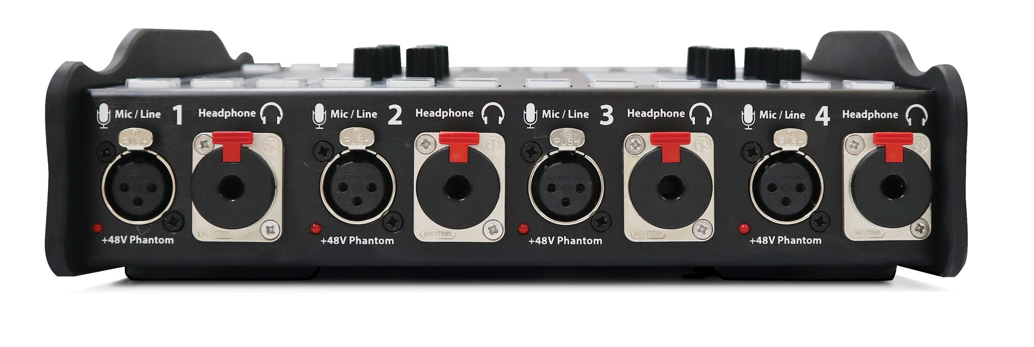 The unit has 4 x locking mic/line inputs with +48V phantom power indication and 4 x headphone outputs on locking 6.35mm jack sockets.