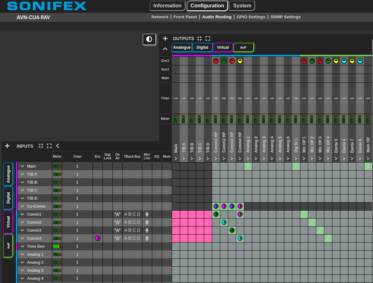 We"ve taken a different approach with the AVN-CU4-RAV. It was designed from the ground up to be totally flexible in operation and the use of Dante AoIP means that inputs and outputs can be added as required (up to a max of 16 per unit). Because any physical analogue or digital input can be mixed and routed with any AoIP input to any physical output or output, you can define your own audio pathways. Additionally you can choose which of those pathways need to be controlled (volume and pan) by the use of rotary encoders.