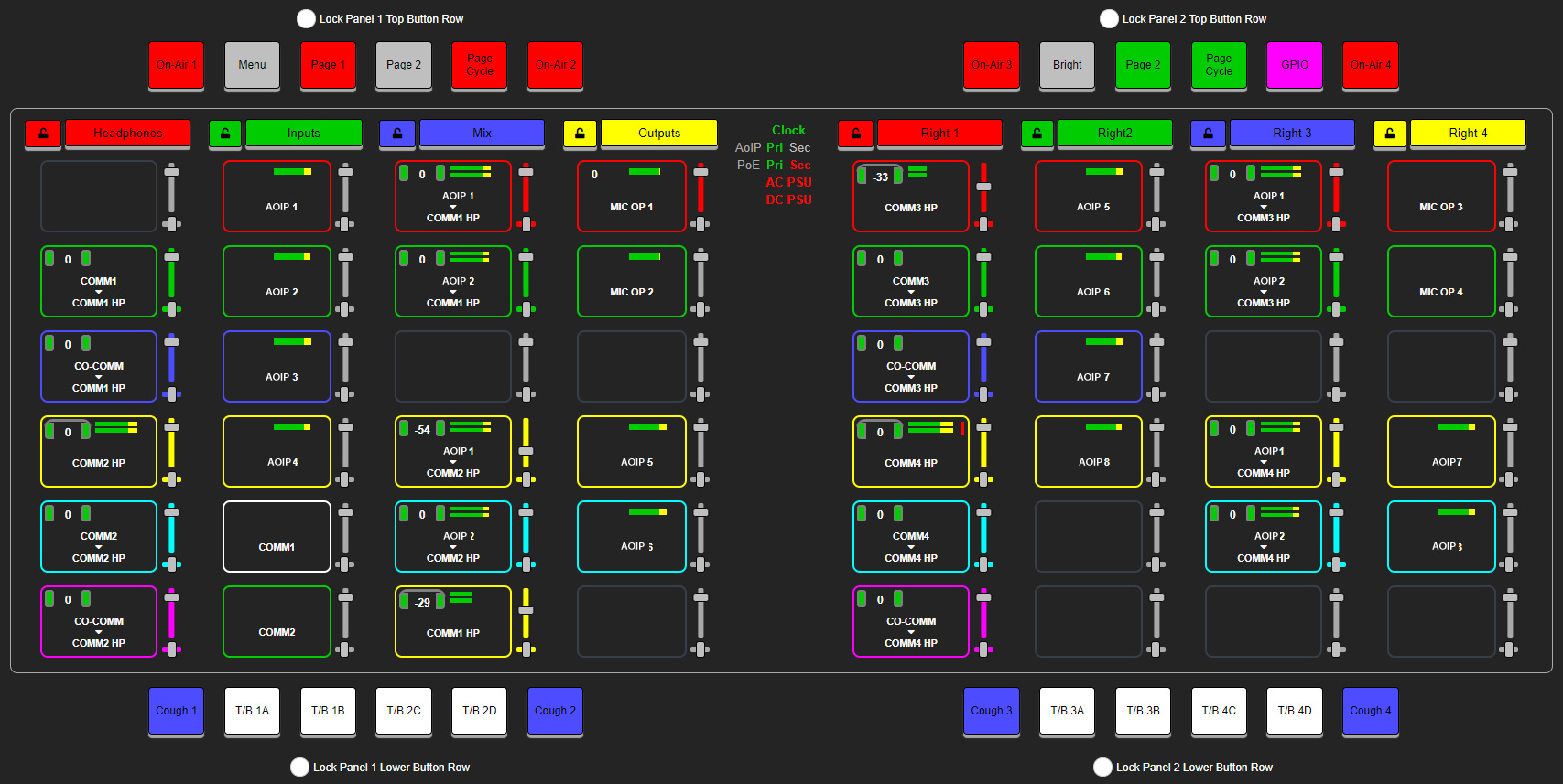 4 x On-Air buttons can be used to connect mic audio to the main output, either over AoIP or via the AES digital audio connection. The On-Air buttons can be locked if required.