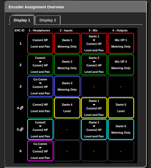 Colours can be programmed per encoder to quickly identify particular source groups, so headphone source selection becomes intuitive.