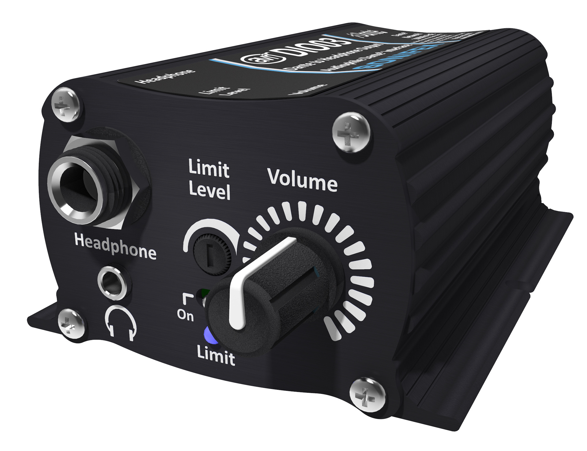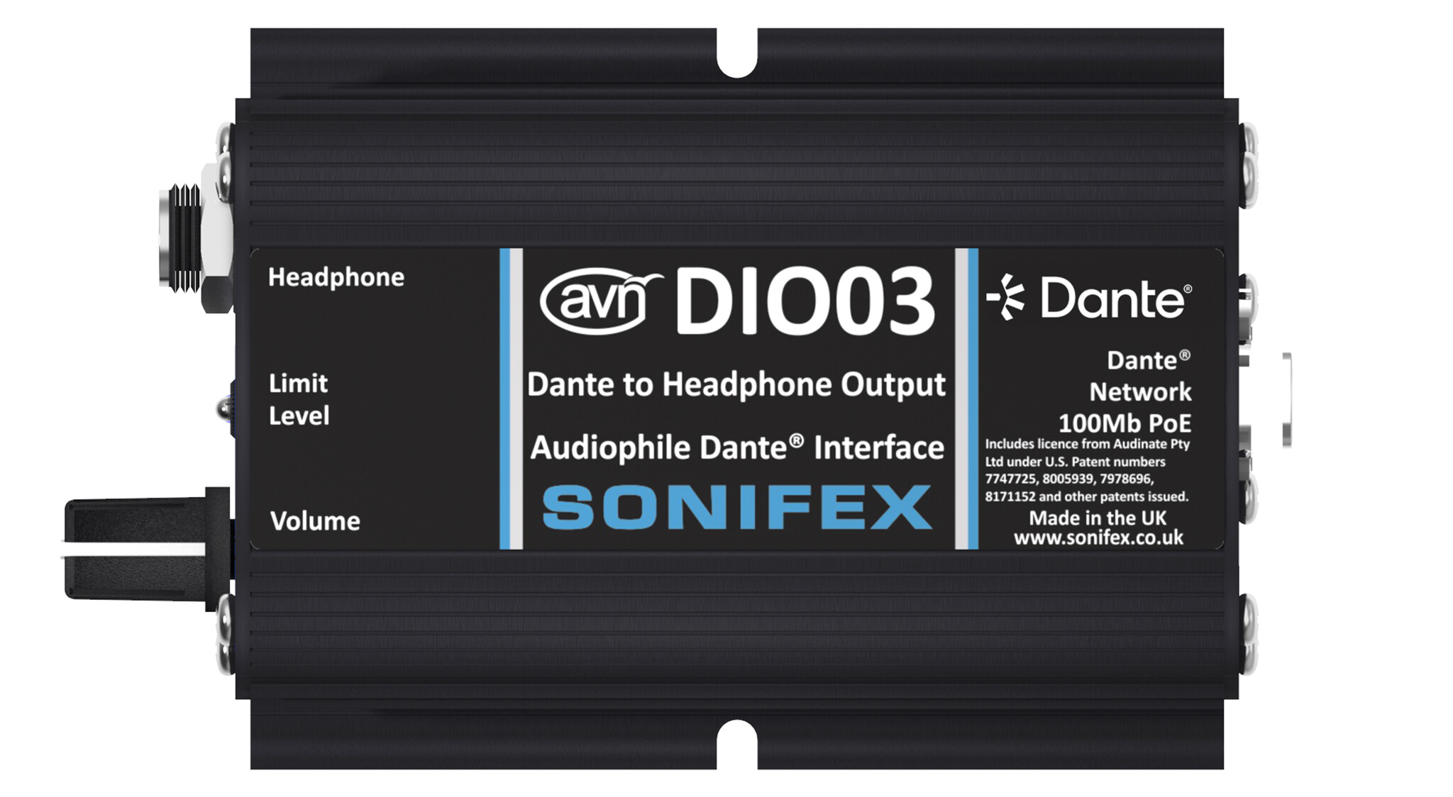 The AVN-DIO03 is Dante AoIP network-to-headphones convertor in the Sonifex DIO range of Dante input/output devices. It features a single stereo headphone output available on two connections for 1/4" and 3.5mm jacks and a volume control for headphones level. A limiter with threshold setting and LED indication can be switched in to prevent over-shooting and protect hearing.