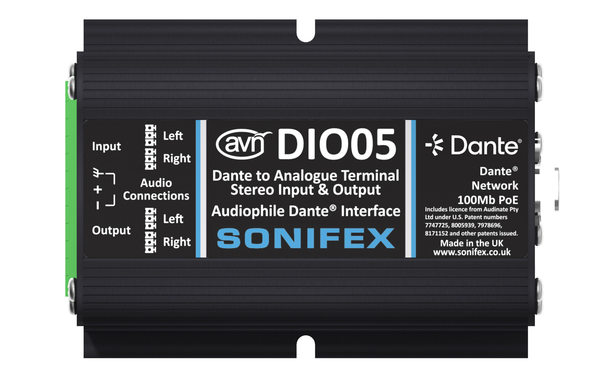 The AVN-DIO05 is a Dante to analogue terminal block input and output convertor in the Sonifex DIO range of Dante input/output devices. It features balanced stereo analogue inputs and outputs on a terminal block connector and one Neutrik EtherCon® connector for direct connection to a Dante AoIP network.