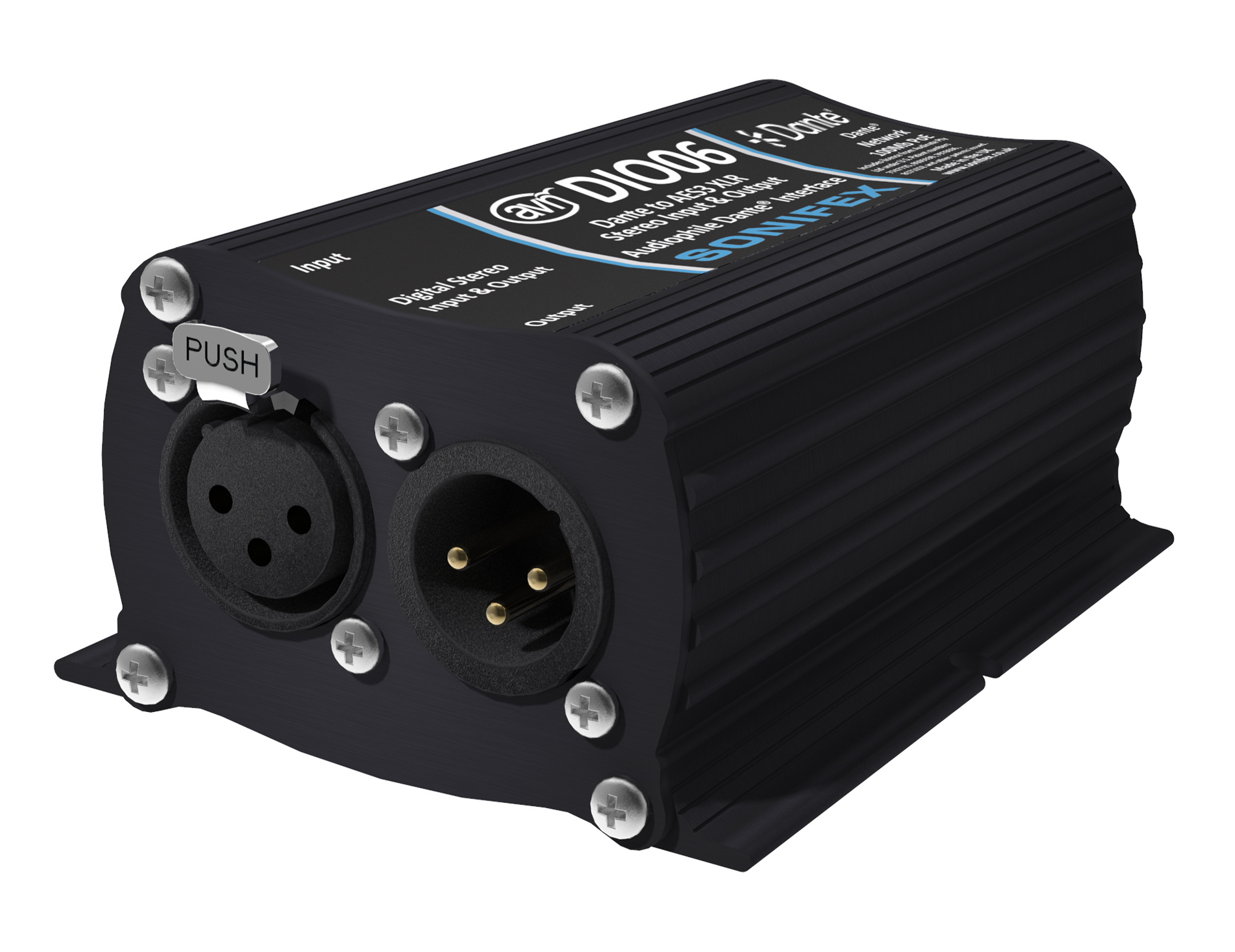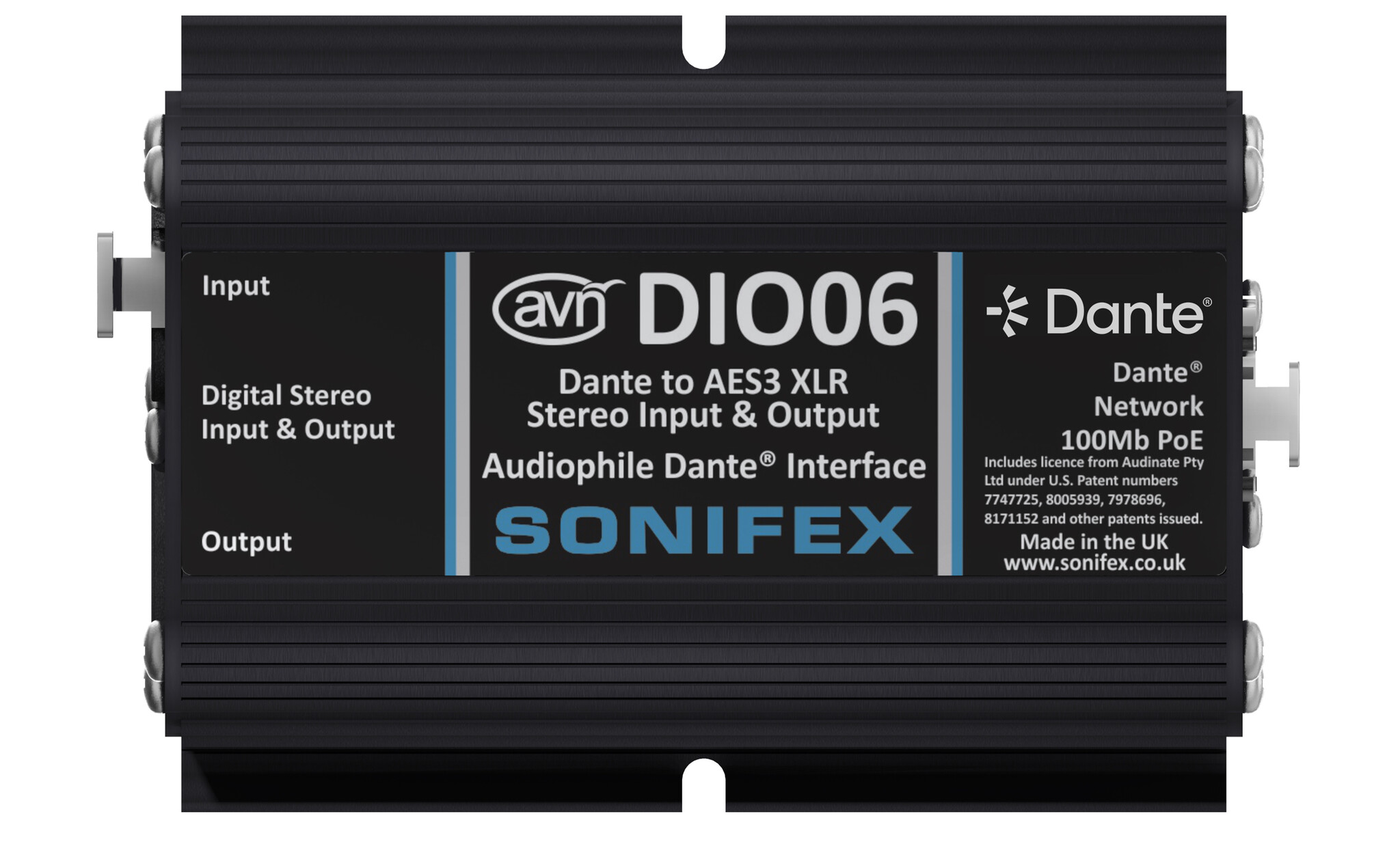 The AVN-DIO06 is a Dante to AES3 digital input and output audio convertor in the Sonifex DIO range of Dante input/output devices. It features stereo AES3 digital audio inputs and outputs on Neutrik XLR connectors, and one Neutrik EtherCon® connector for direct connection to a Dante AoIP network.