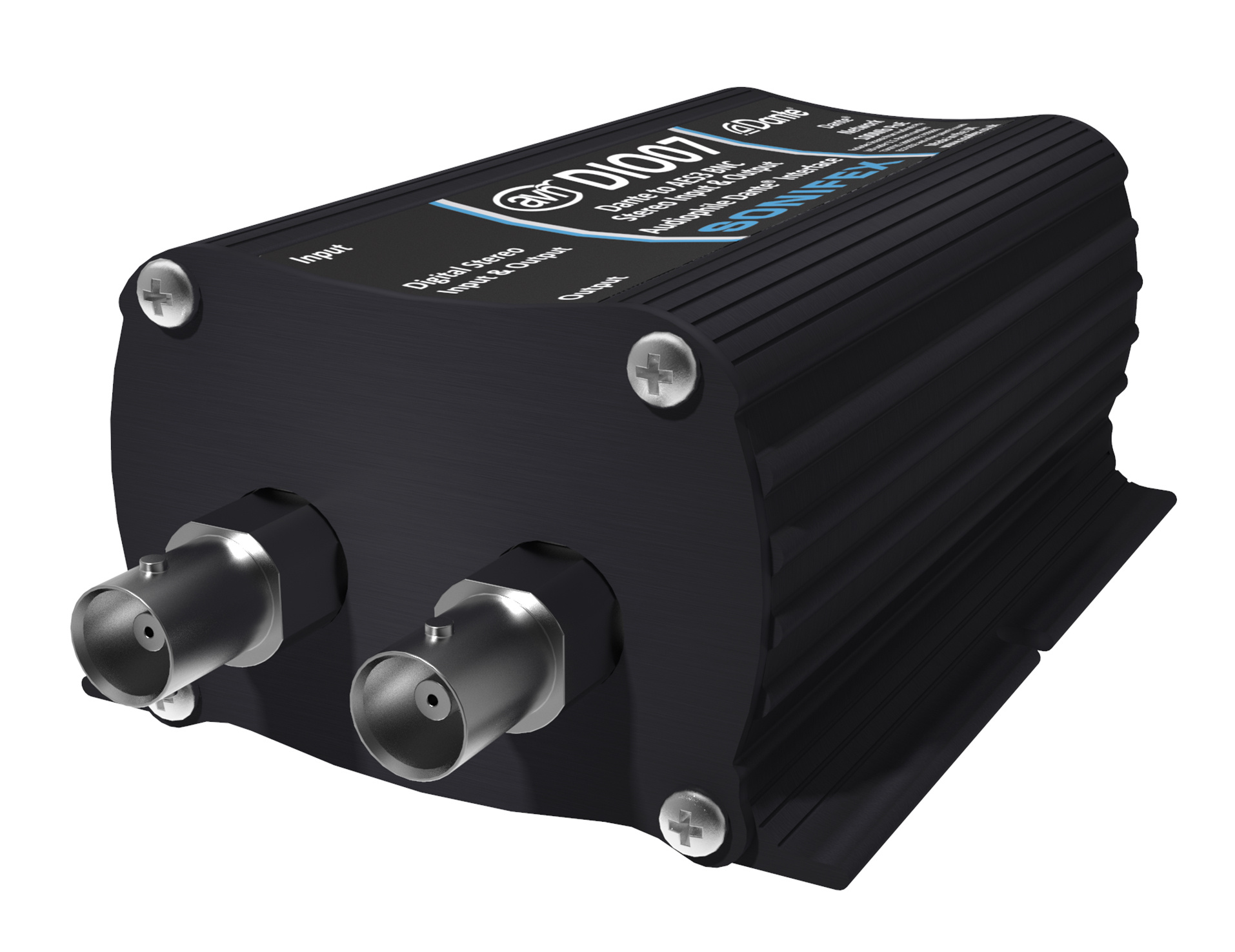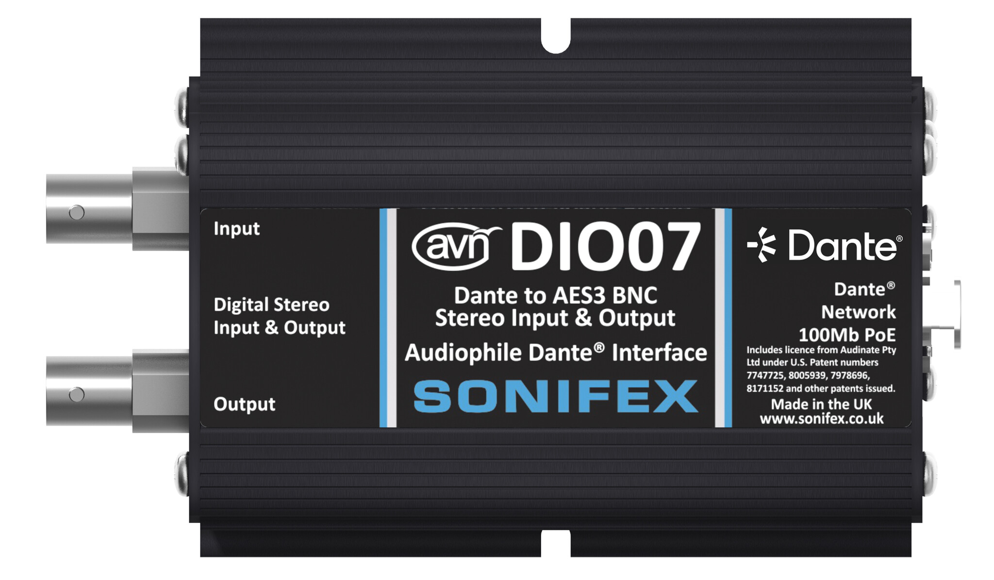 The AVN-DIO07 is a Dante to AES-3id digital input and output audio convertor in the Sonifex DIO range of Dante input/output devices. It features stereo AES-3id digital audio inputs and outputs on BNC connectors, and one Neutrik EtherCon® connector for direct connection to a Dante AoIP network.