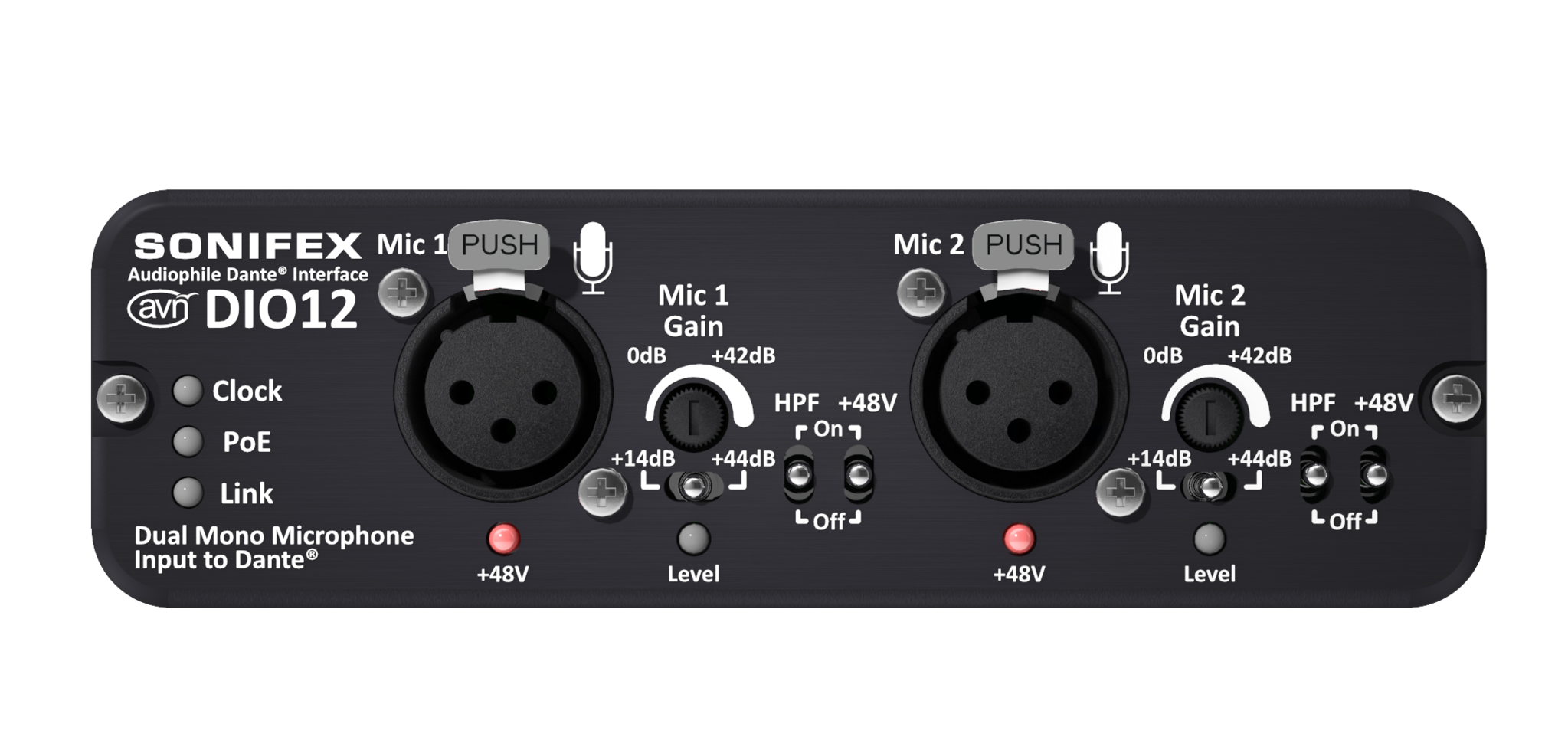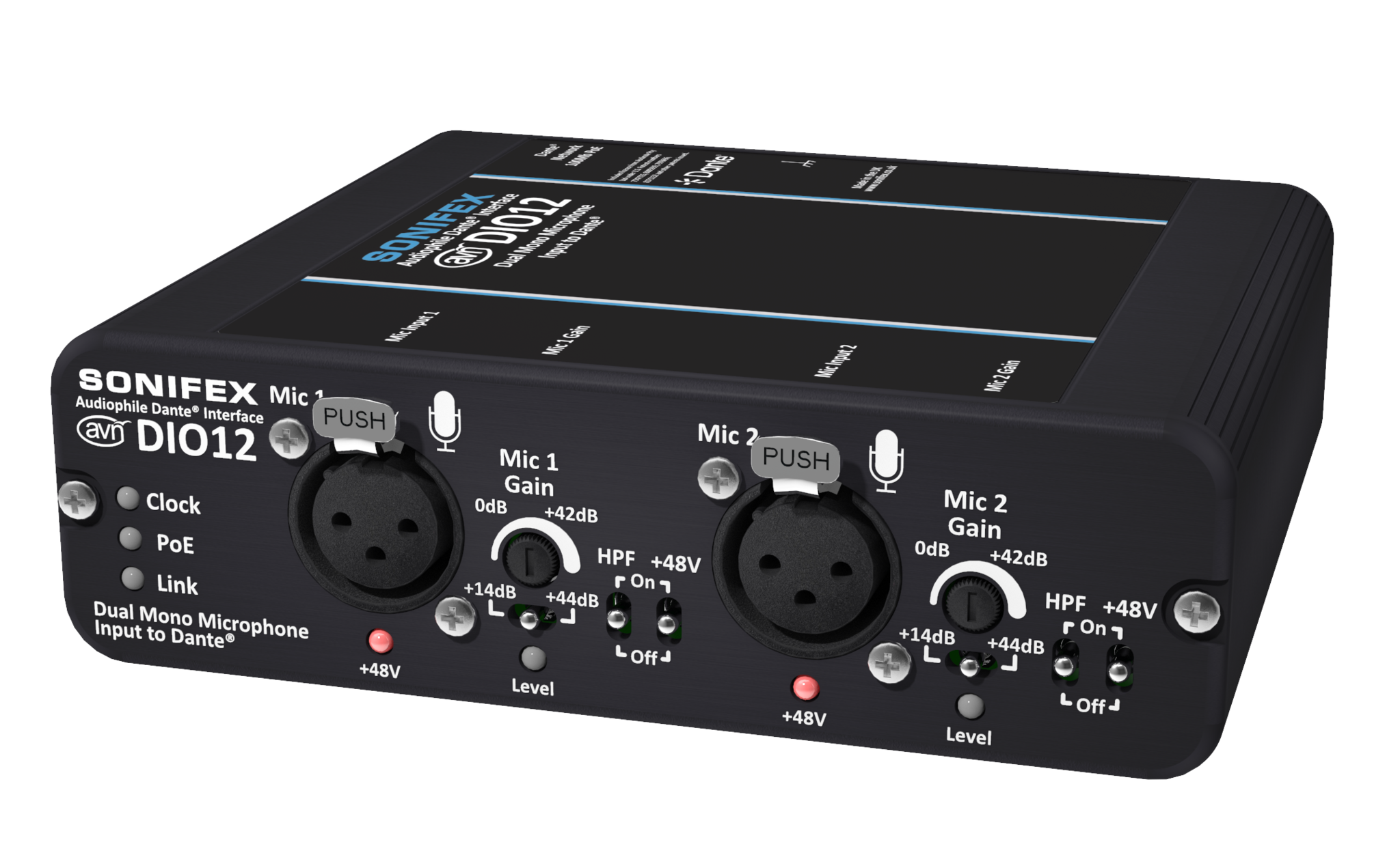 The AVN-DIO12 is a dual microphone input to Dante® converter with adjustable mic gain in the Sonifex DIO range of Dante® input/output devices. It's effectively 2 x AVN-DIO09 units in a single chassis, still offering A/D circuitry with a world-class E.I.N. of 129dB.