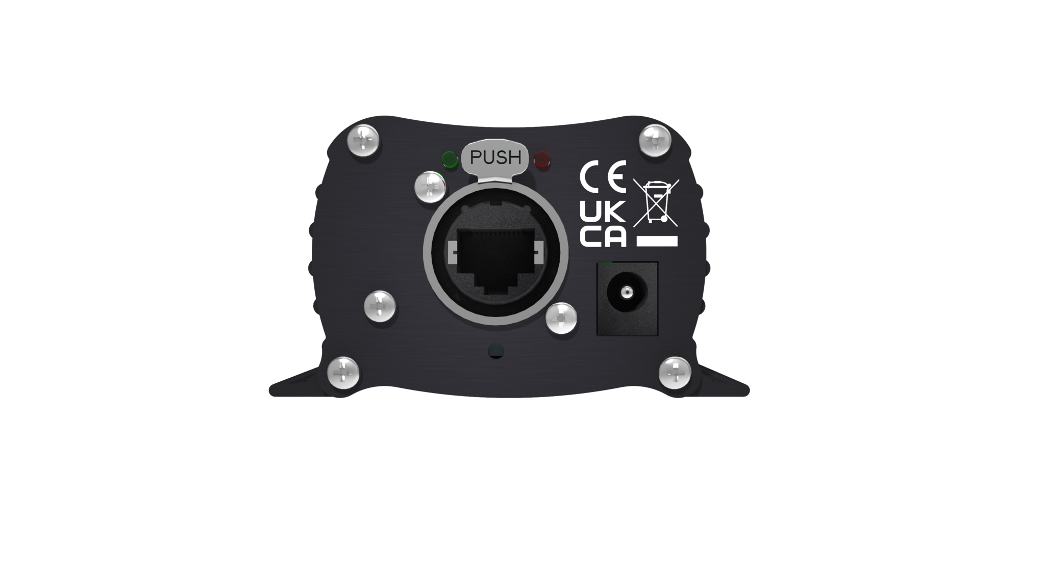 It is housed in a rugged aluminium box with side slots for screw-mounting and is powered by PoE (Power over Ethernet).