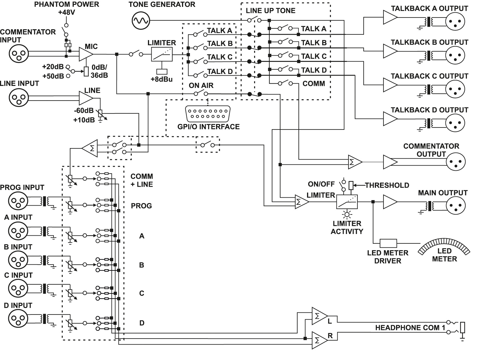 It provides a fully featured commentator position and a line-level input. The unit has an individual commentator output, with an additional output providing a mix of commentator and line input audio. A limit indicator on the main panel shows when the adjustable limiter on the main output is active, and a bright 21 segment LED PPM meter, which can be disabled, shows the main output level.