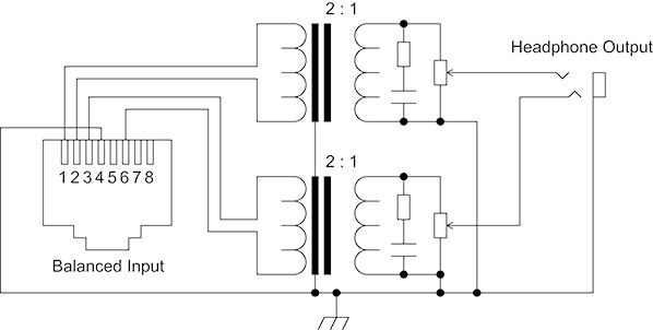 The transformer ratio of 2:1 ensures that any headphone load presented at the output is reflected through to the input at a 1:4 ratio (hence a 150? set of headphones looks like 600? at the input, a suitable load for most good quality line output stages).